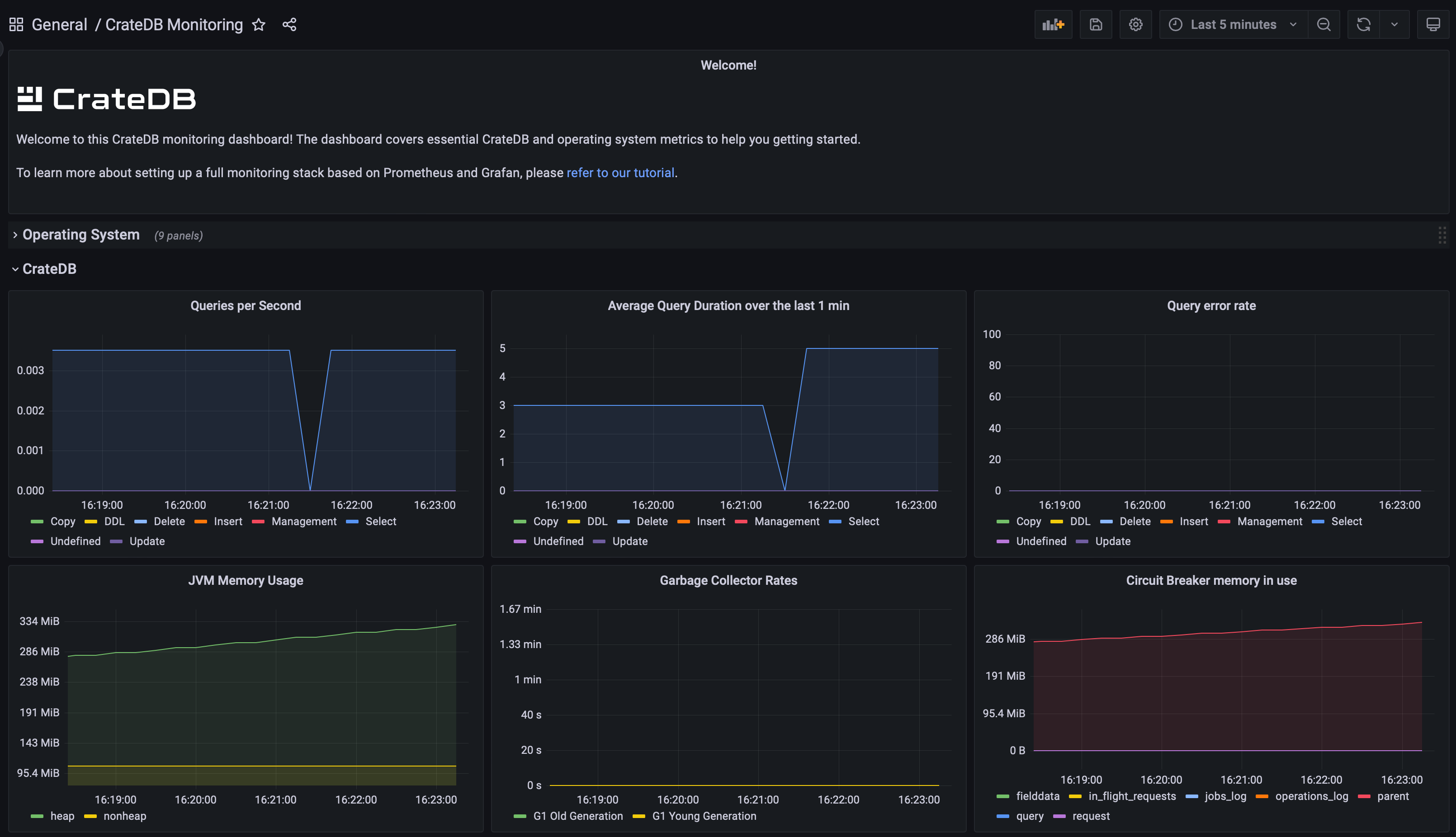 This dashboard includes all important metrics to monitor a CrateDB cluster. It is particularly useful when setting up your own on-premise CrateDB cluster.