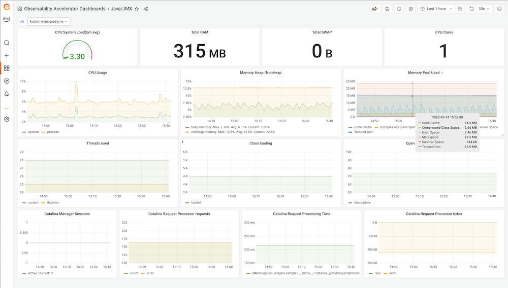 This dashboard is part of the AWS Observability Accelerator and enables you to monitor JVM metrics with Prometheus / JMX Exporter.