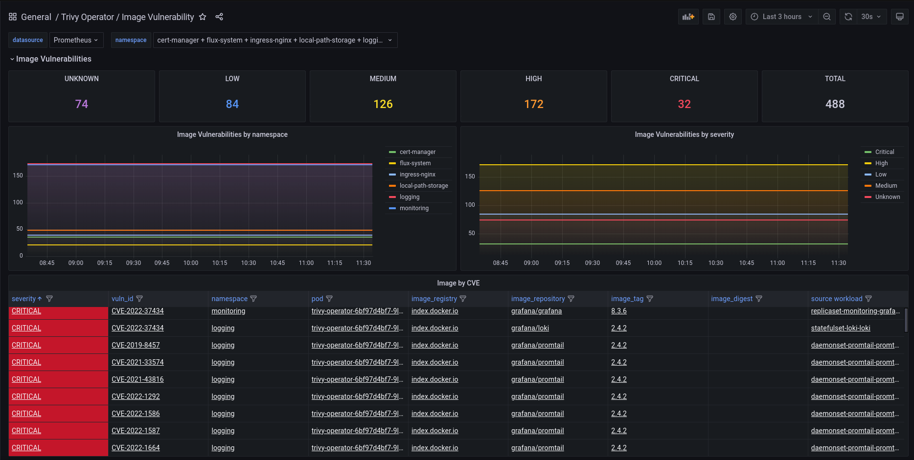 Monitore Trivy Image Vulnerabilities. Based on https://grafana.com/grafana/dashboards/17080-trivy-image-vulnerabilities/ and https://grafana.com/grafana/dashboards/16652-trivy-operator-reports/.