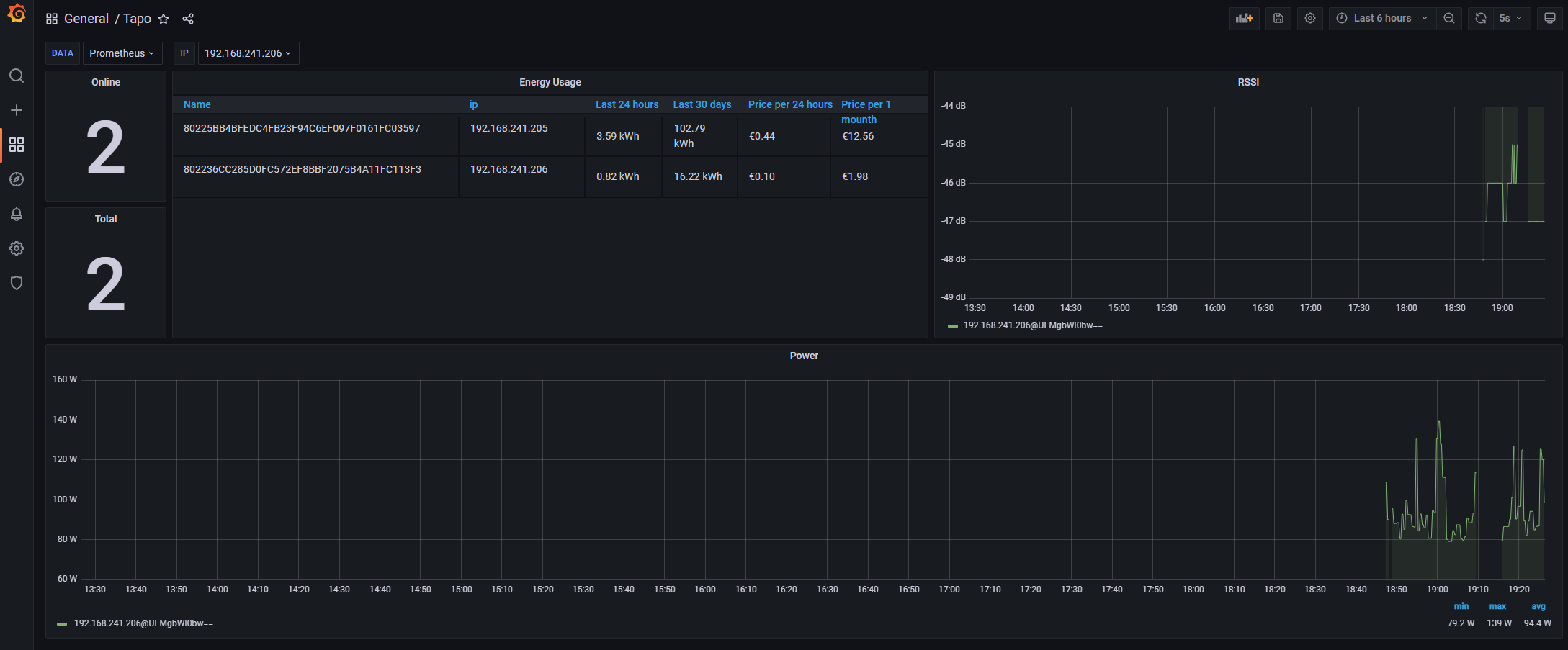 Smart Plug metrics for TP-Link Tapo P110 Energy Monitoring Dashboard has: energy usage, current power consumption, wifi signal and state More information: https://github.com/miroRucka/tapo-smartplug