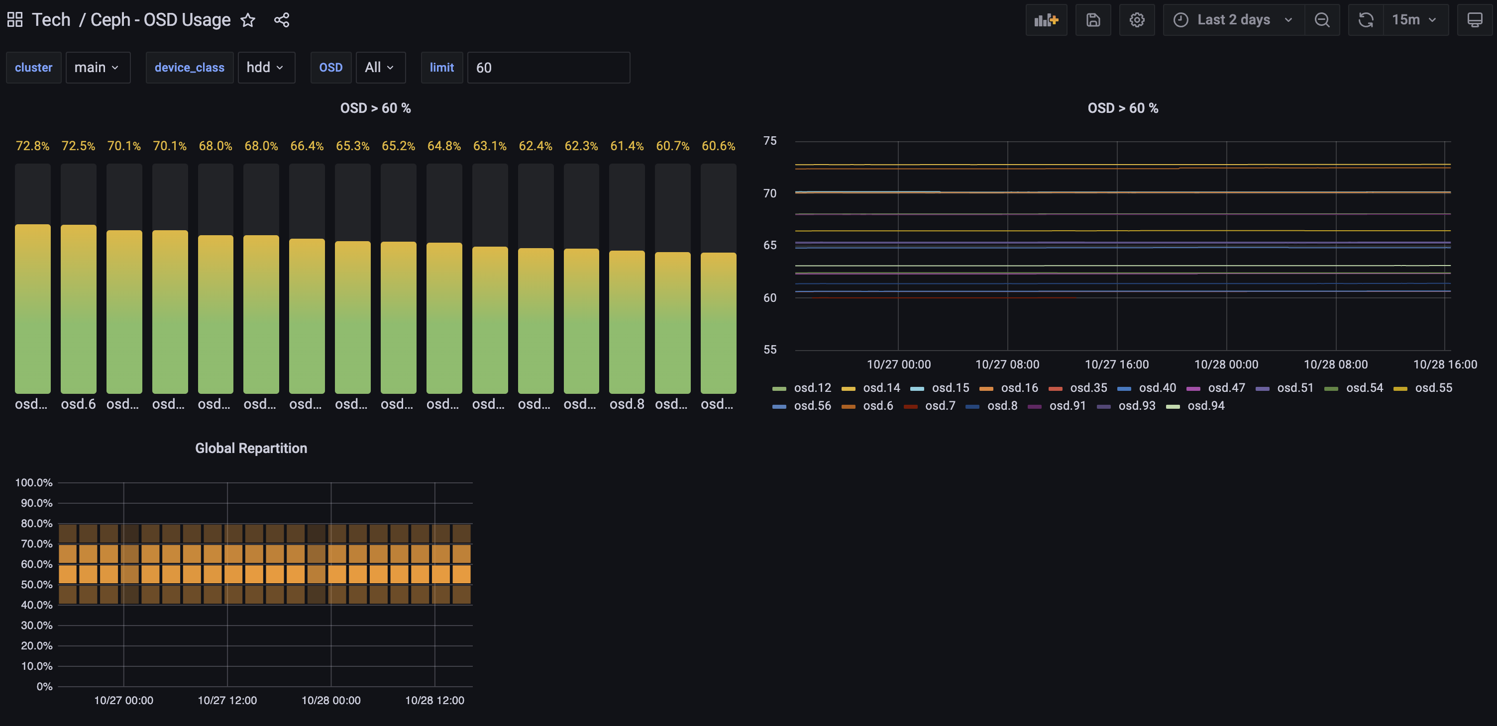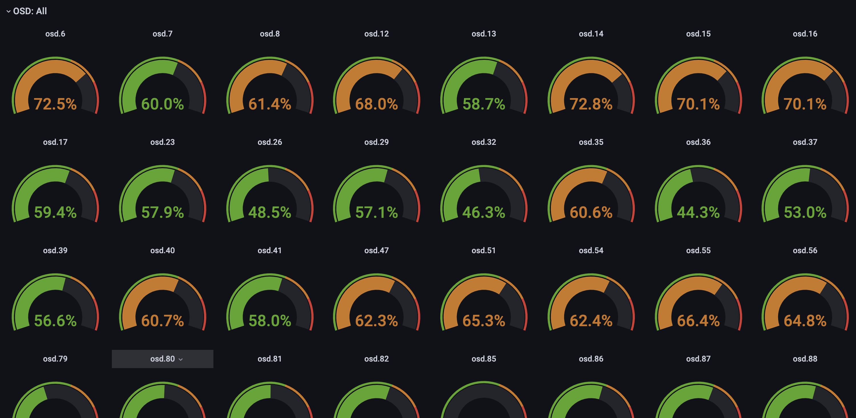 Simple dashboard to view OSD usage. For multiple clusters, requires a label with the cluster name in the prometheus target : "cluster":"mycluster"