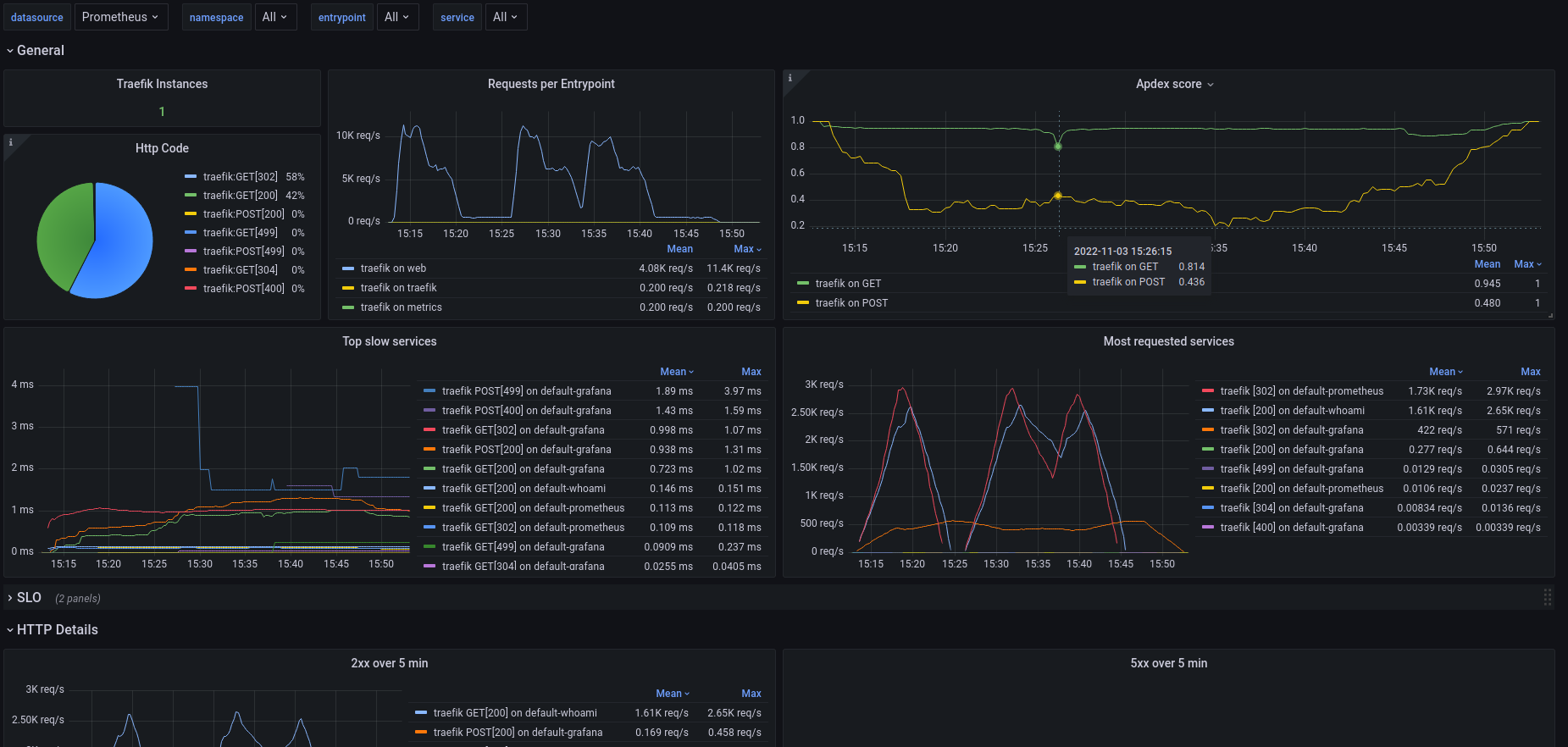Official dashboard for Traefik on Kubernetes. It uses native prometheus metrics from Traefik and namespace label. It can be filtered by DataSources, Services and Entrypoint.
