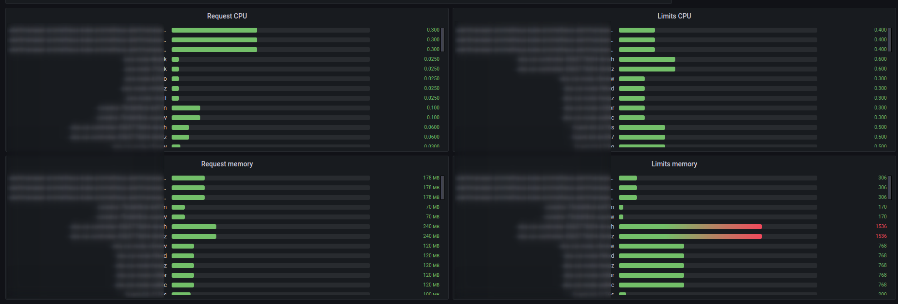 Showing memory in namespace, showing memory in nodes, showing memory all cluster pods and memory/cpu limits/requests