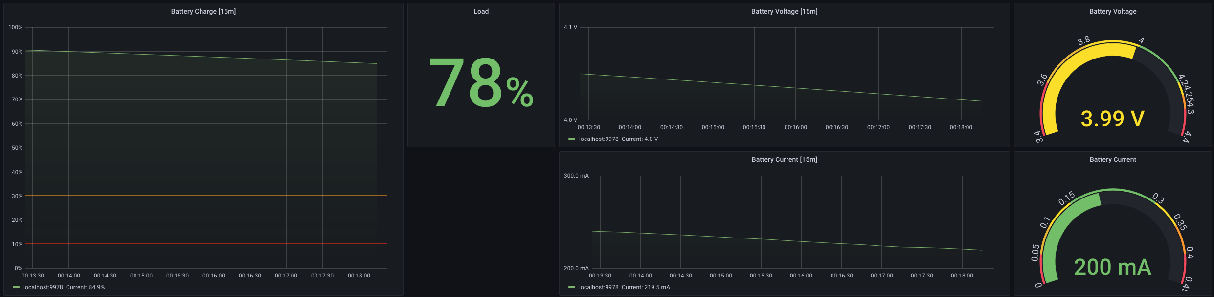 The PiSugar dashboard uses the prometheus data source to create a Grafana dashboard with the gauge, graph and stat panels.