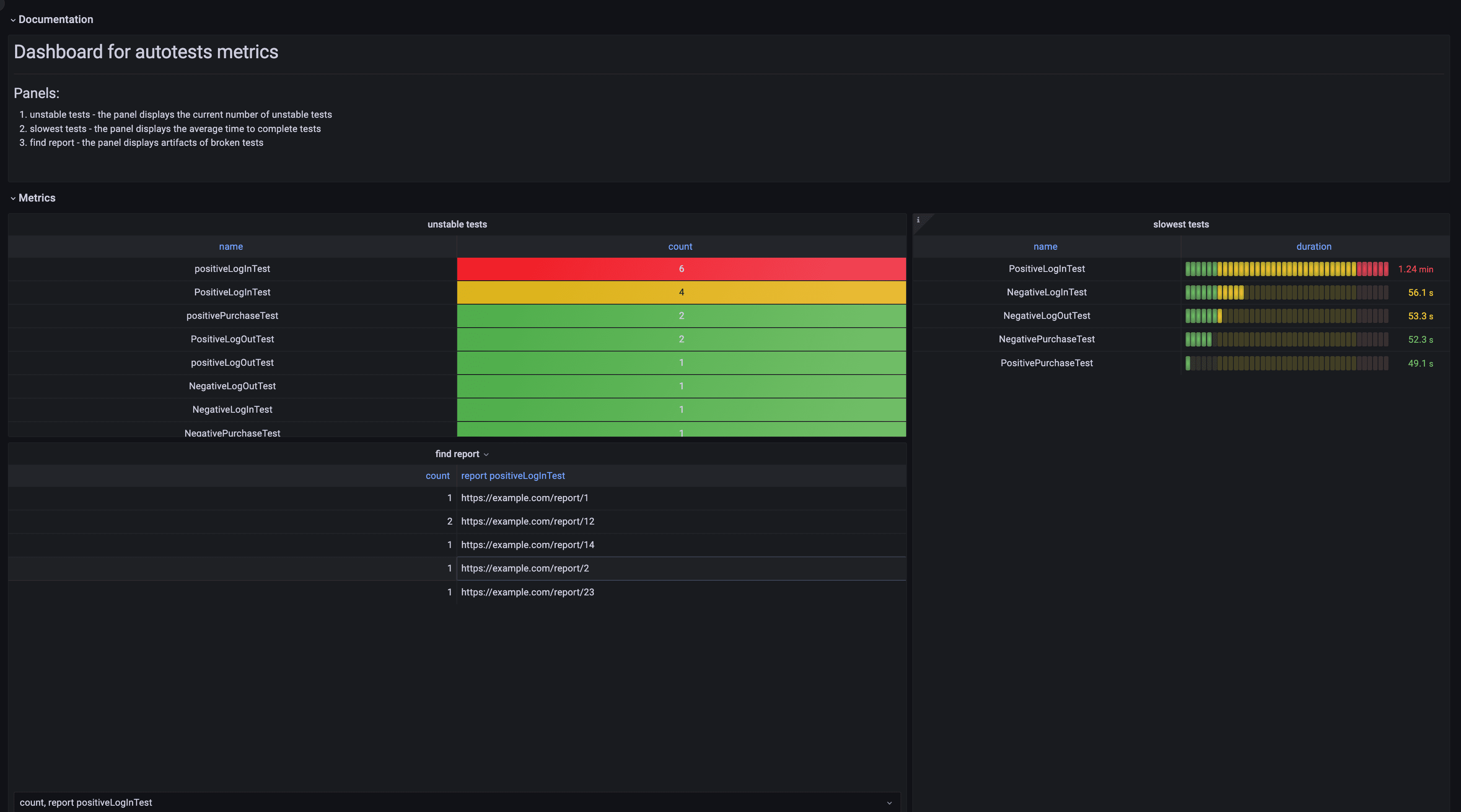 The Test metrics dashboard uses the influxdb data source to create a Grafana dashboard with the table and text panels.