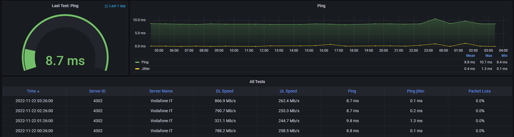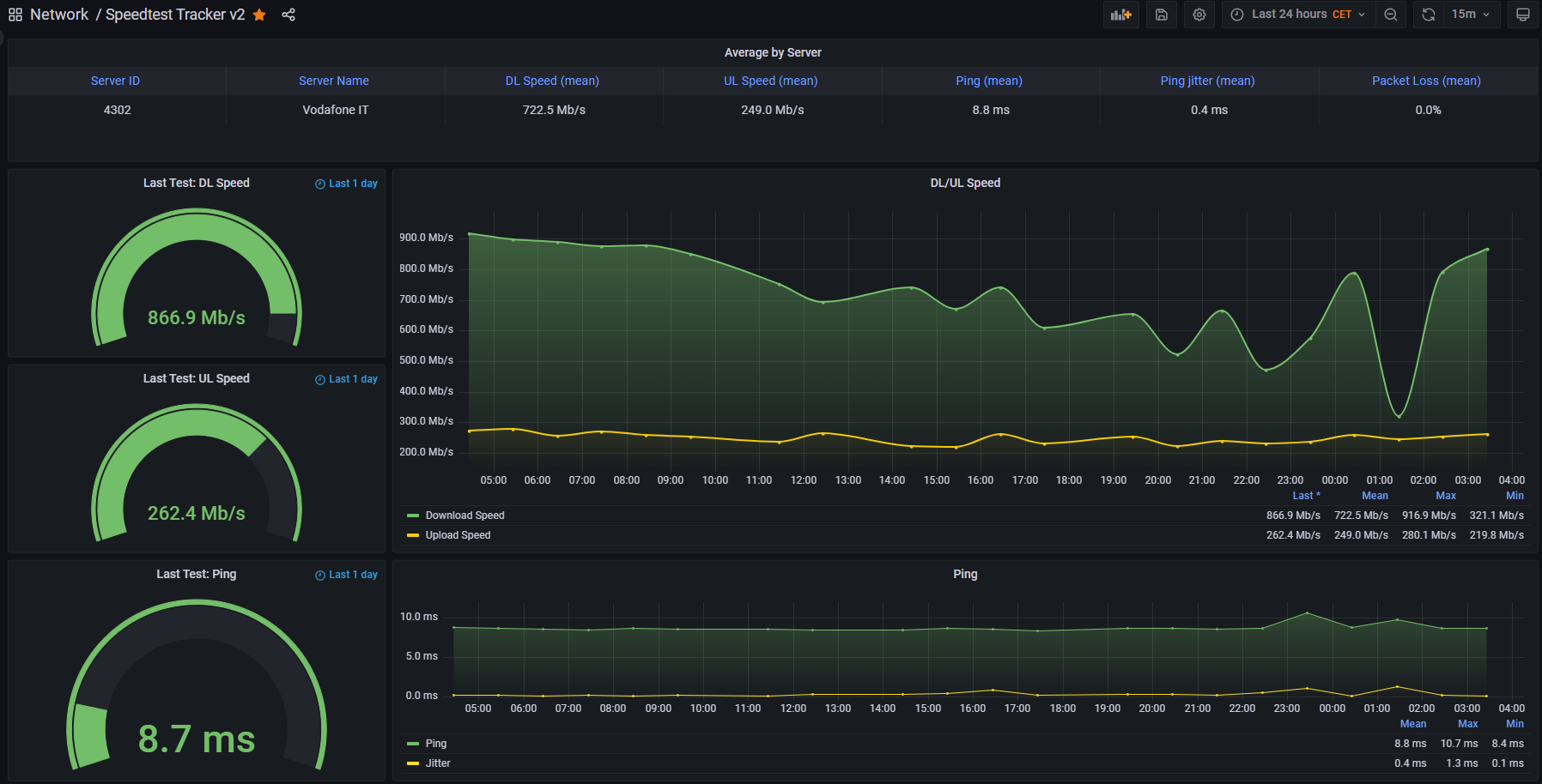 Dashboard for data published by Speedtest Tracker v2 by @alexjustesen: https://github.com/alexjustesen/speedtest-tracker