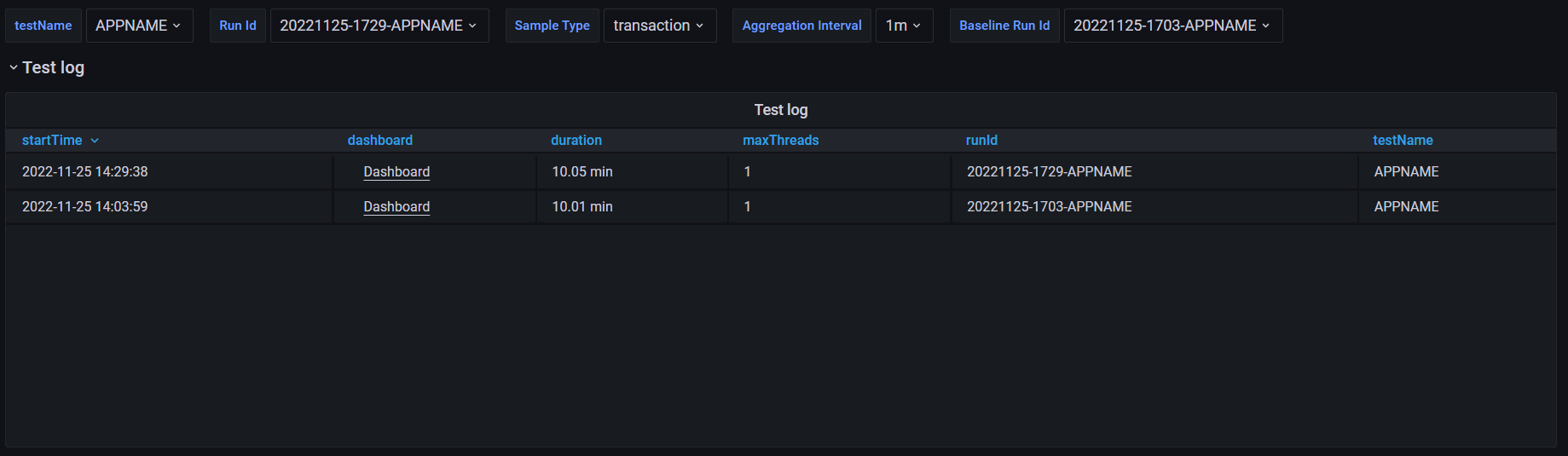 - runId: YOUR_TEST_ID (For example: ${__time(yyyyMMdd-HHmm)}-appname)