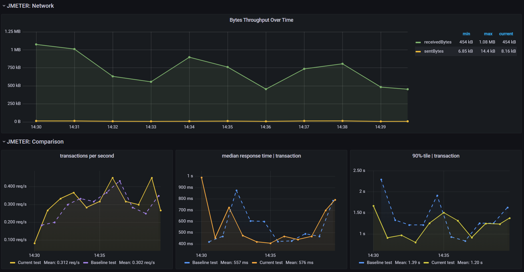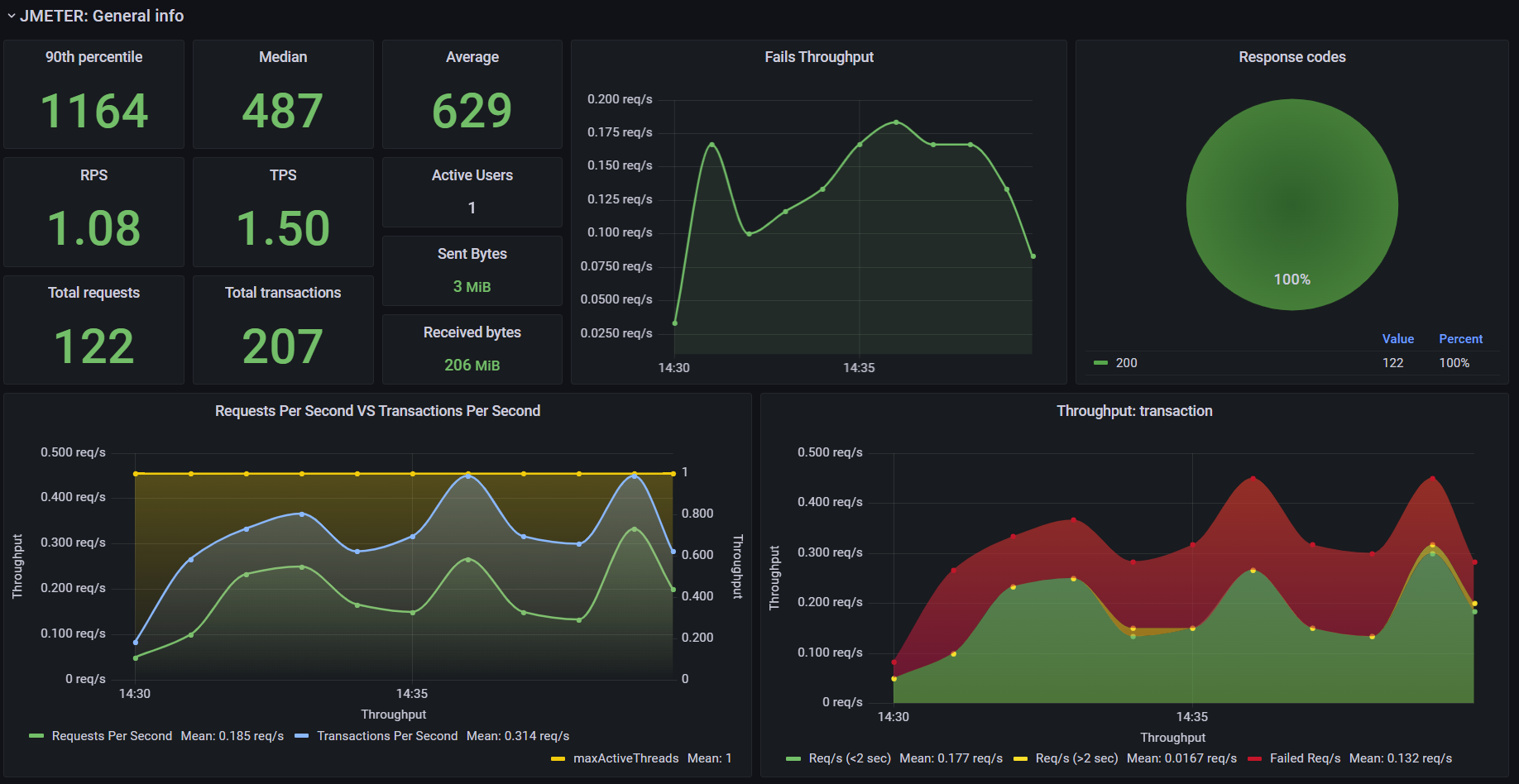 This dashboard shows live load test metrics provided by JMeter