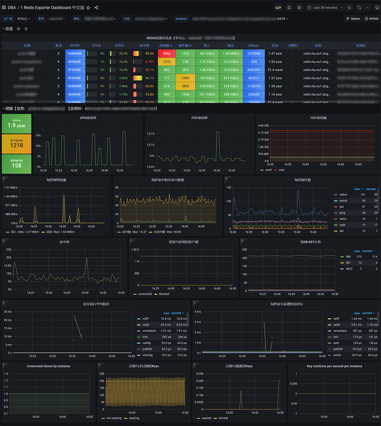 该看板也支持自建redis使用,使用redis_exporter的指标均能正常展示。(总览图中少量云资源的指标在自建redis中会无法展示,其它图表不影响。)