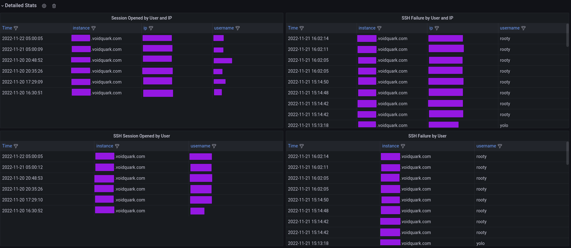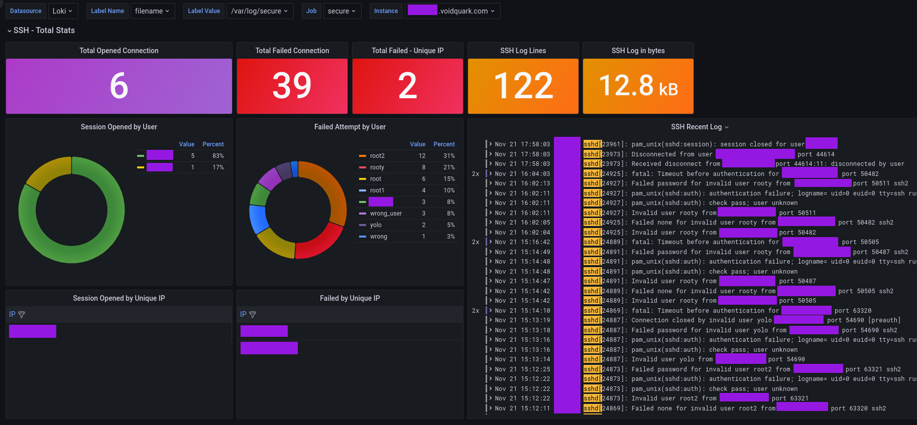 How to use this dashboard with explanation in blog: https://voidquark.com/blog/parsing-ssh-logs-with-grafana-loki ( Promtail config, Query explained, Alertmanager rule ).