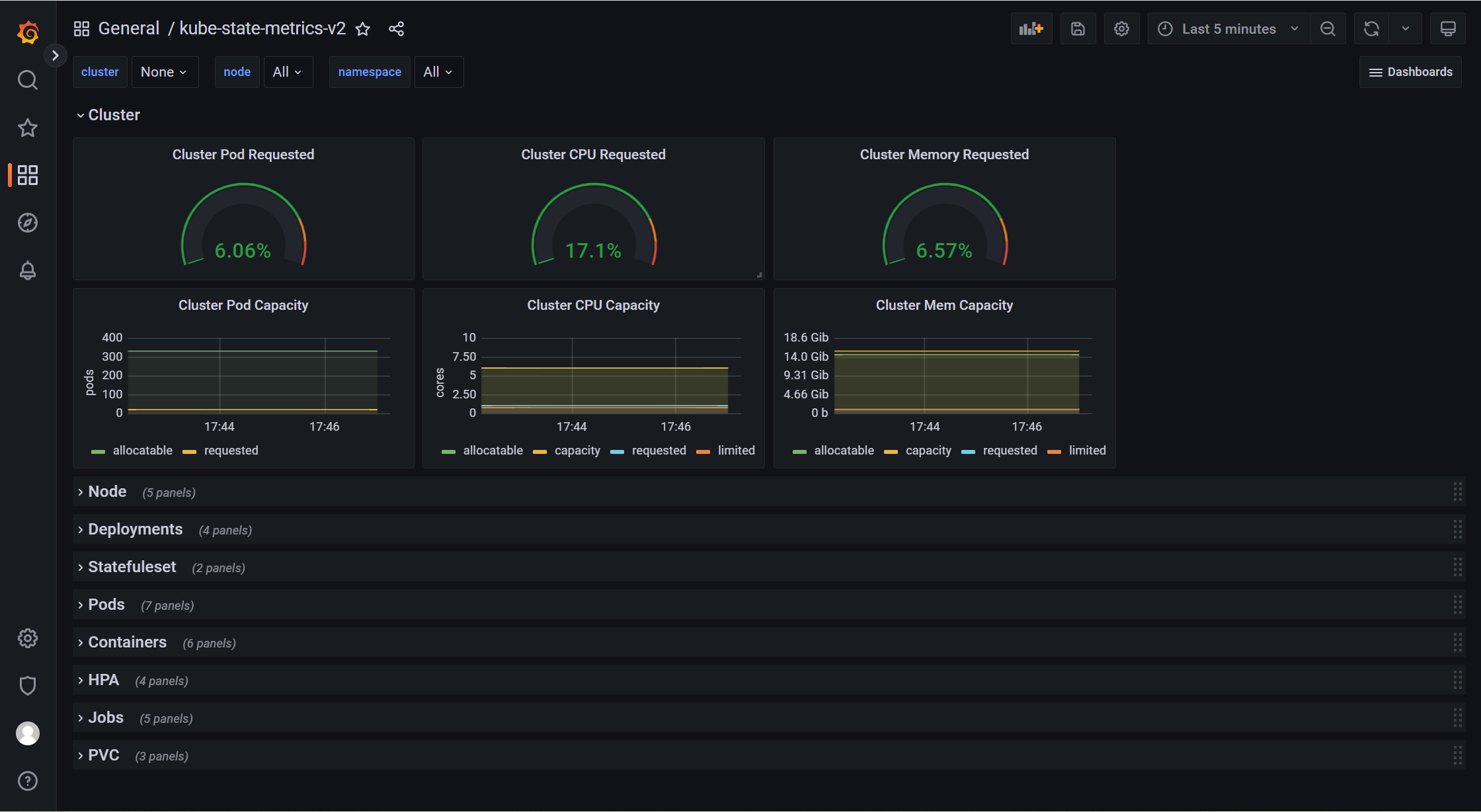 Summary metrics about kube-state-metrics v2 version(https://github.com/kubernetes/kube-state-metrics); Same as the other two, the only difference is that this is a corrected version. You only need to configure auto-discovery to complete the dashboard Please install kube-state-metrics and configure the namespace 和其他两个一样,唯一不同的是,这是一个修正版本。 你只需要配置自动发现就可以完成dashboard 请安装kube-state-metrics,并且配置名称空间