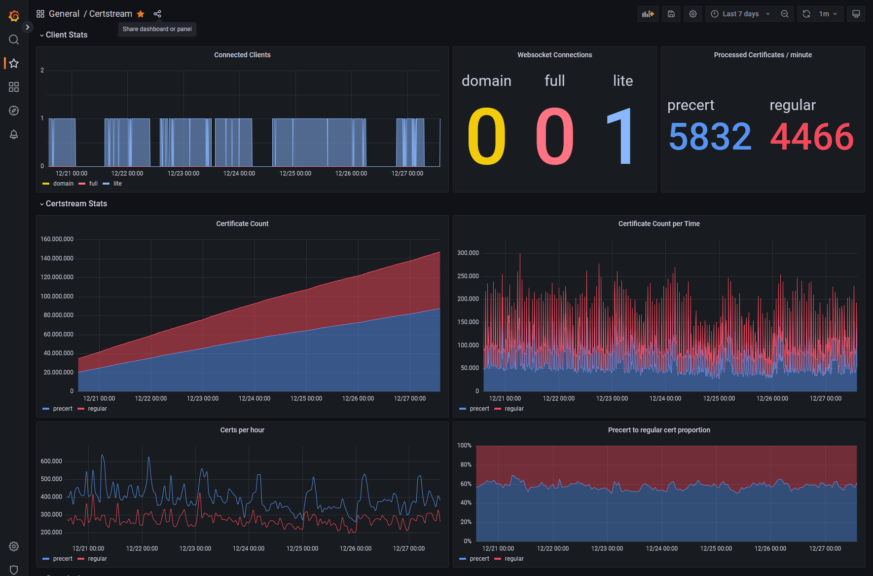 A helpful dashboard for monitoring metrics of your certstream-server-go instance.