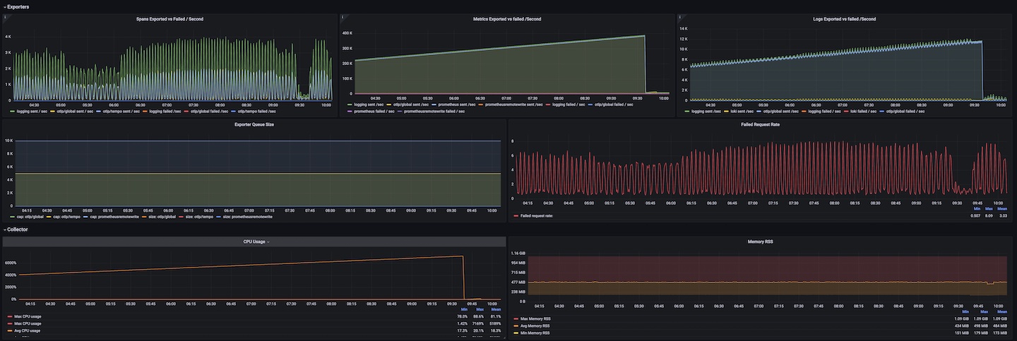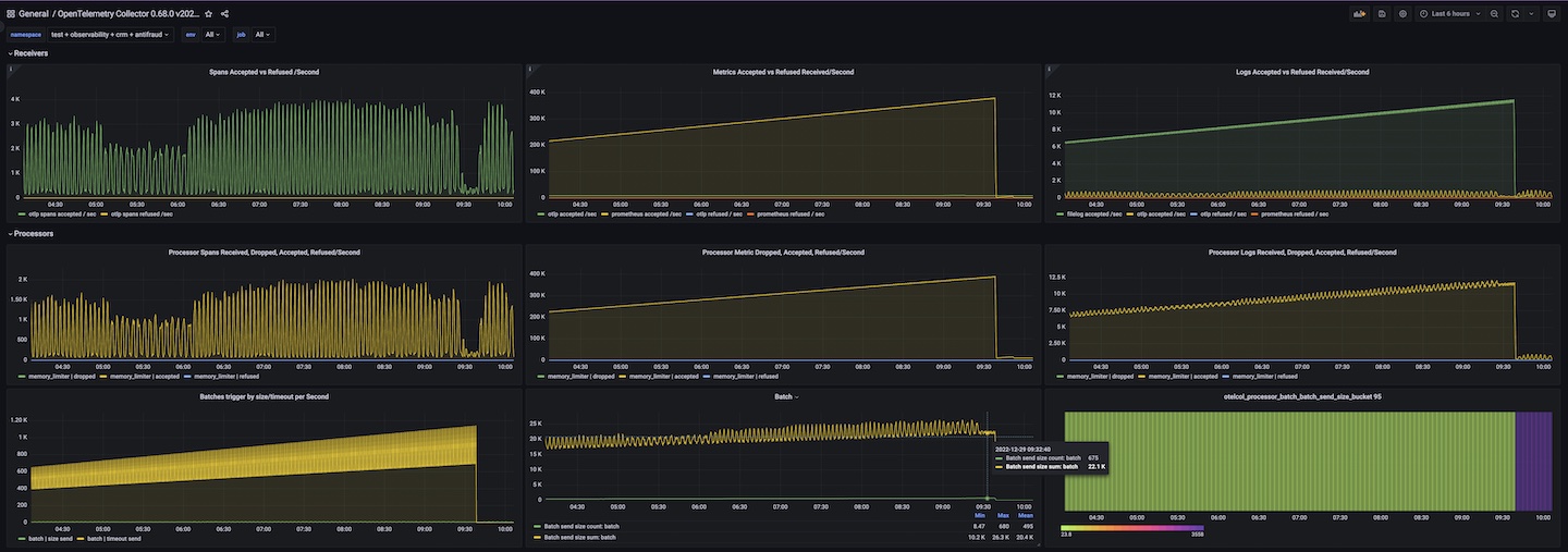 OpenTelemetry Collector version: 0.68.0 with usage of processors: memory_limiter, batch In addition: designed for Logs, Metrics and Traces