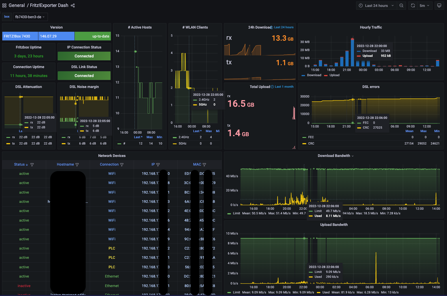 Exporter: https://github.com/pdreker/fritz_exporter since 2.1 with FRITZ_HOST_INFO enabled.