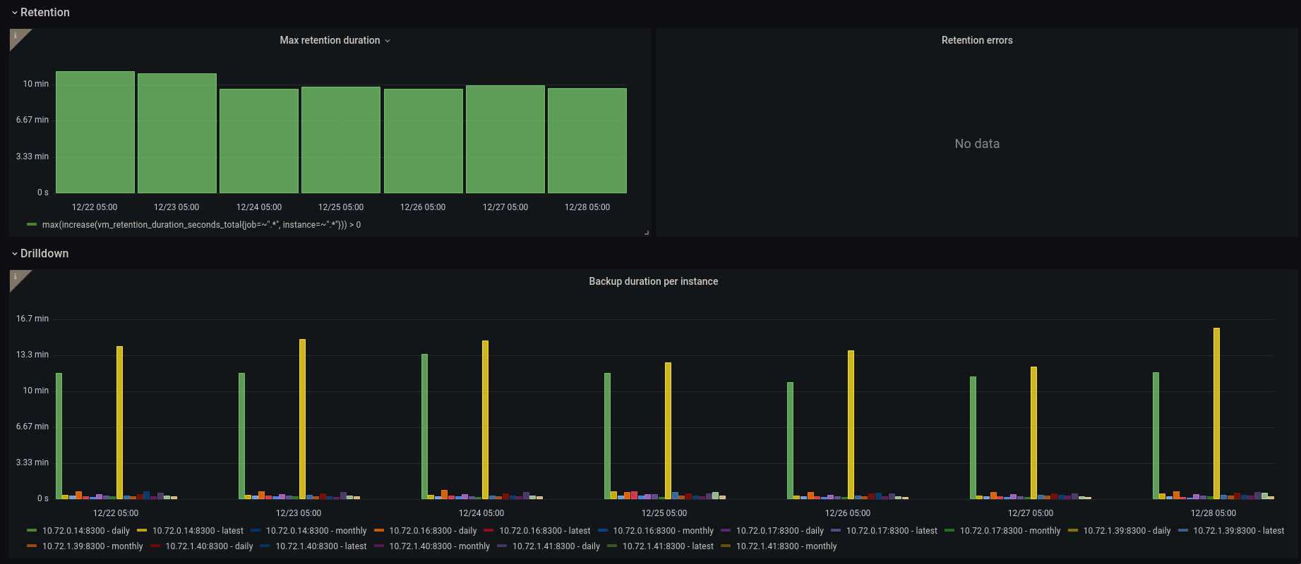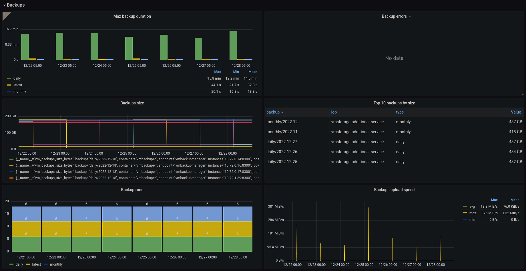 The dashboard contains visualization of the most useful metrics for vmbackupmanager, displaying status of last backup and retention runs, number of stored backups, and storage space used for backups storage. It covers such aspects as backups duration, size of stored backups, upload rate, retention statistics. If you have suggestions, improvements or found a bug - feel free to add an issue or add review to the dashboard.