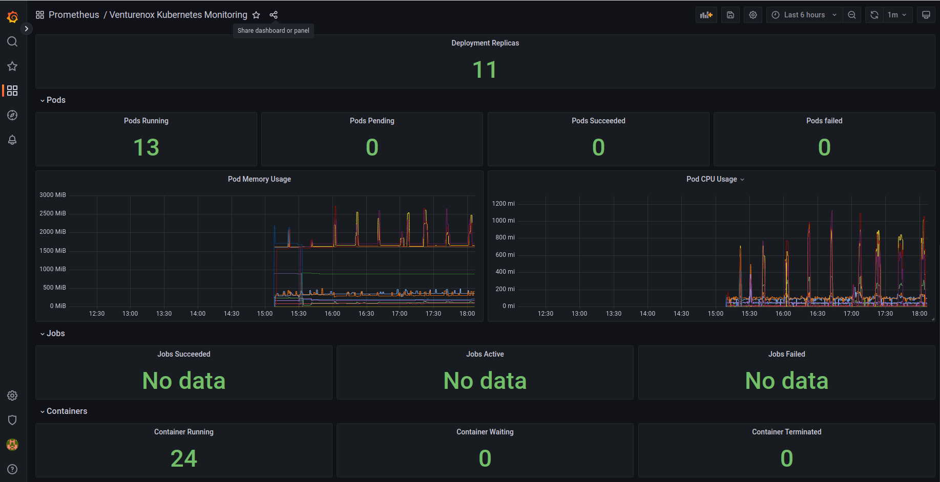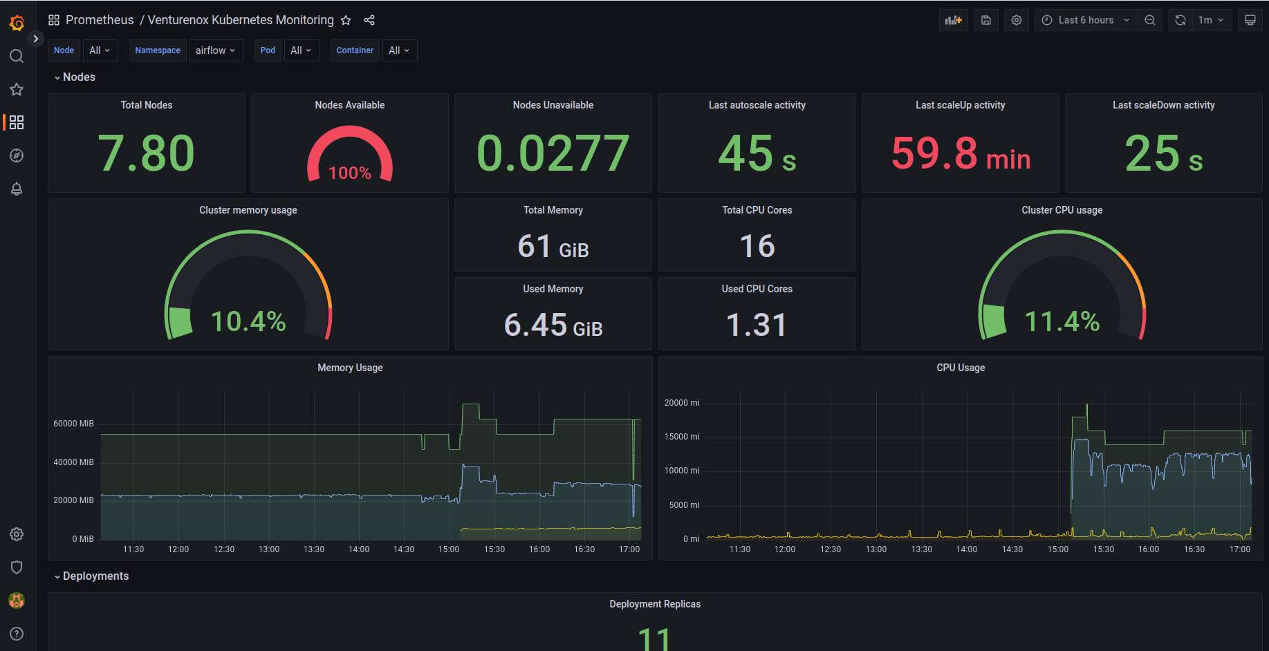 This dashboard provide following kubernetes metrics: -Node metrics -Autoscaling metrics -Pods metrics -Jobs metrics -Resource Utilization