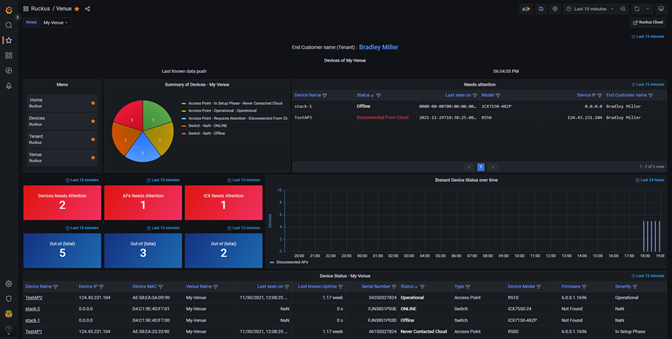 The Ruckus MSP Cloud Dashboard - Venue dashboard uses the influxdb data source to create a Grafana dashboard with the piechart, stat, table and timeseries panels.