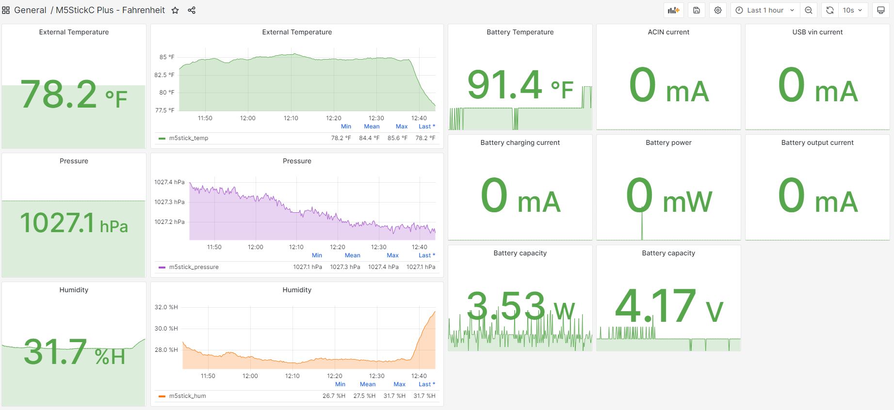 This dashboard will display in °F. For the Celsius version, go here: https://grafana.com/grafana/dashboards/17782-m5stickc-plus/