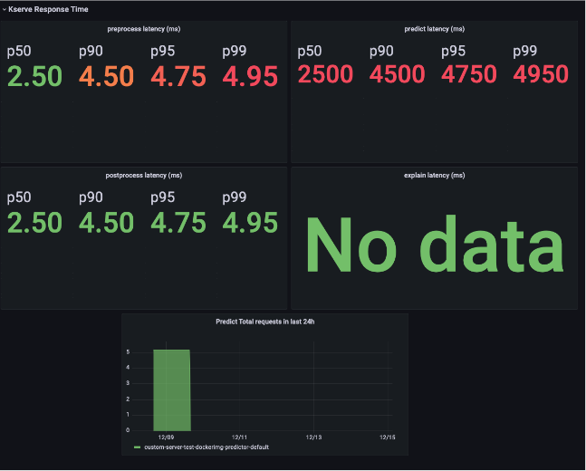 Latency metrics for pre/post-process, predict, and explain steps & total number of requests Requires inferenceservices to use KServe >= v0.10. See KServe observability docs for more info.