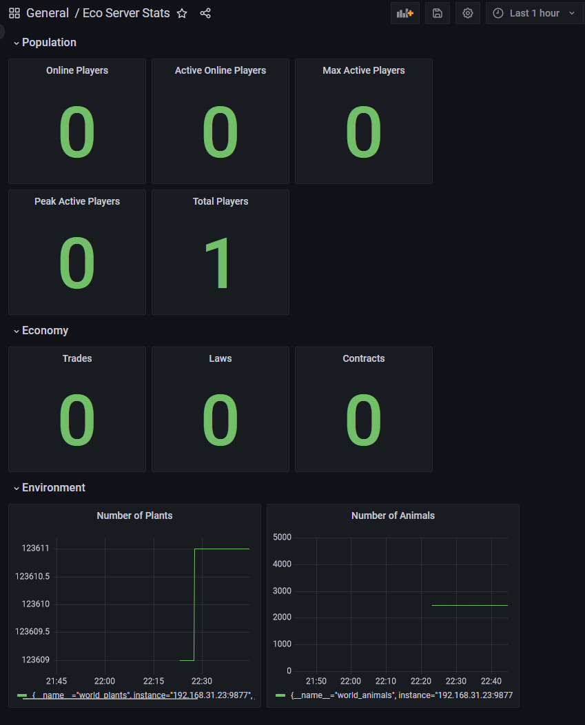 Dashboard for metrics for Eco Server exported by https://github.com/BrandonDalton/eco-prometheus-exporter