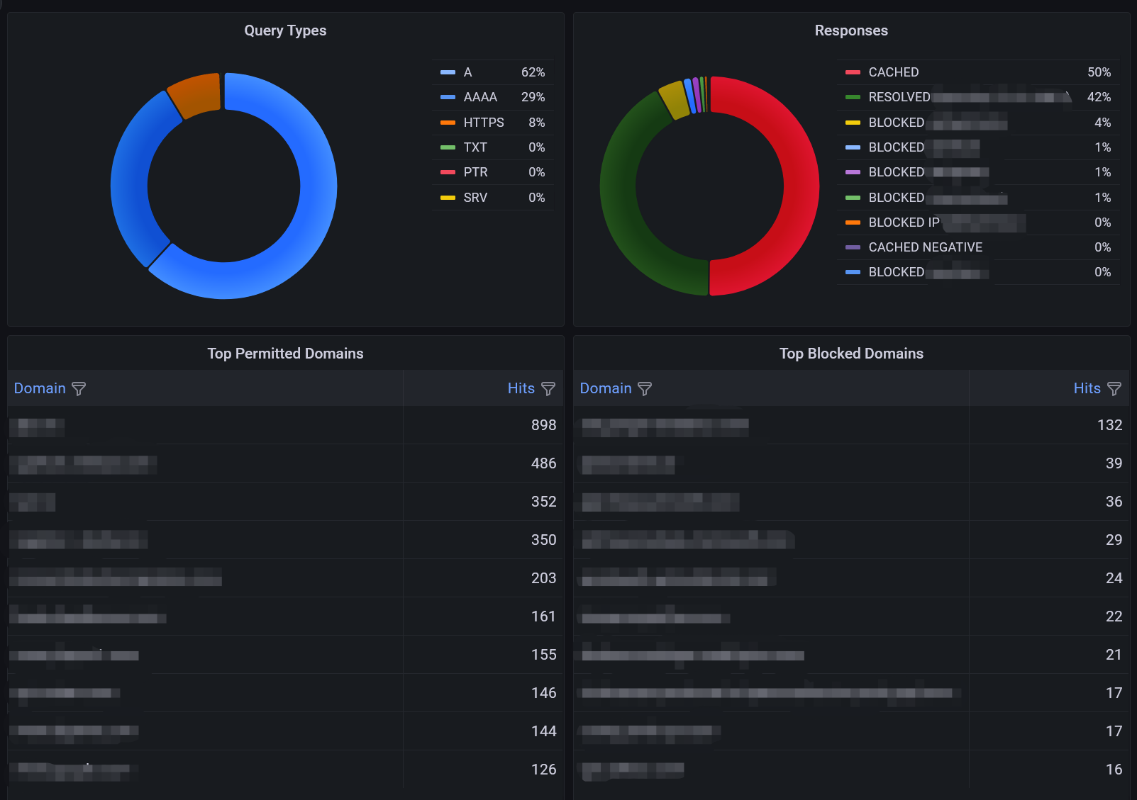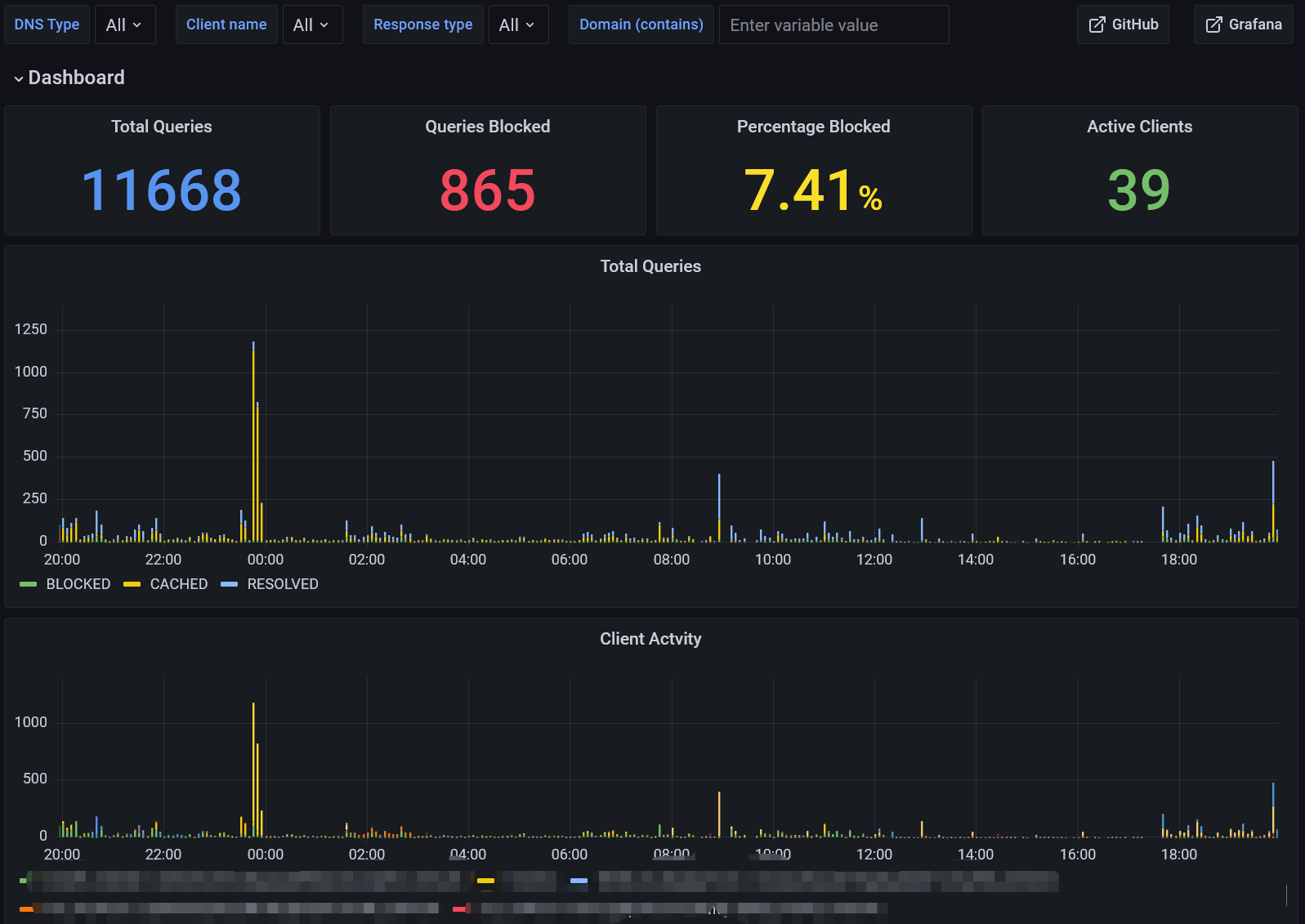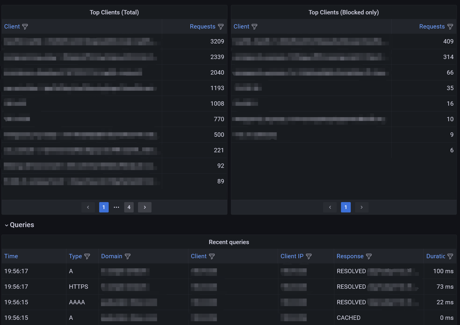 This is a Grafana dashboard for Blocky with PostgreSQL query logging. It displays top clients, top domains, recent queries and more.