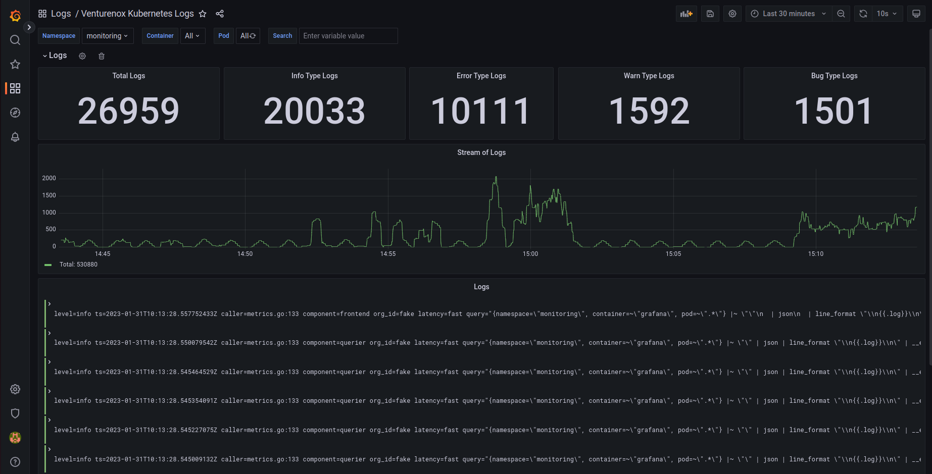 The Venturenox Kubernetes Logs dashboard uses the loki data source to create a Grafana dashboard with the logs panel.