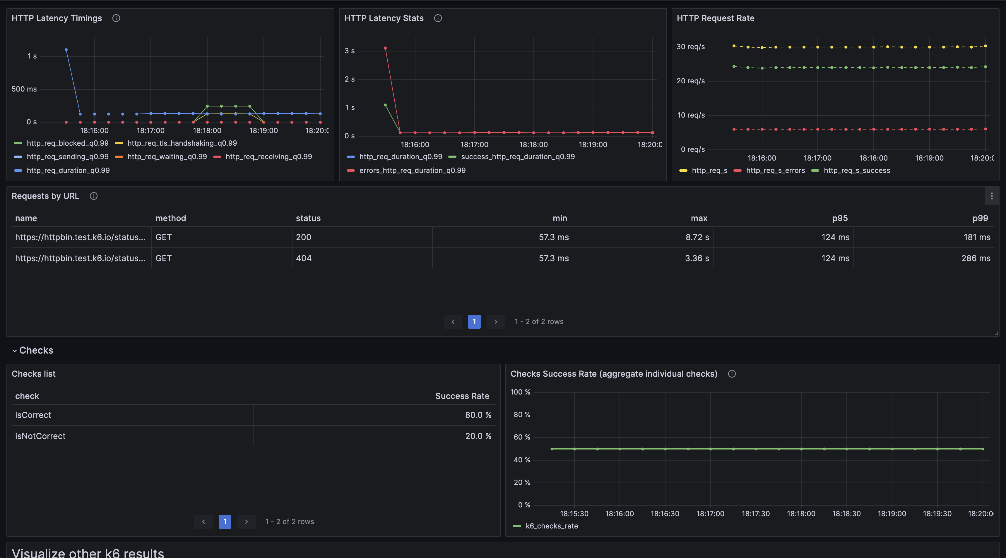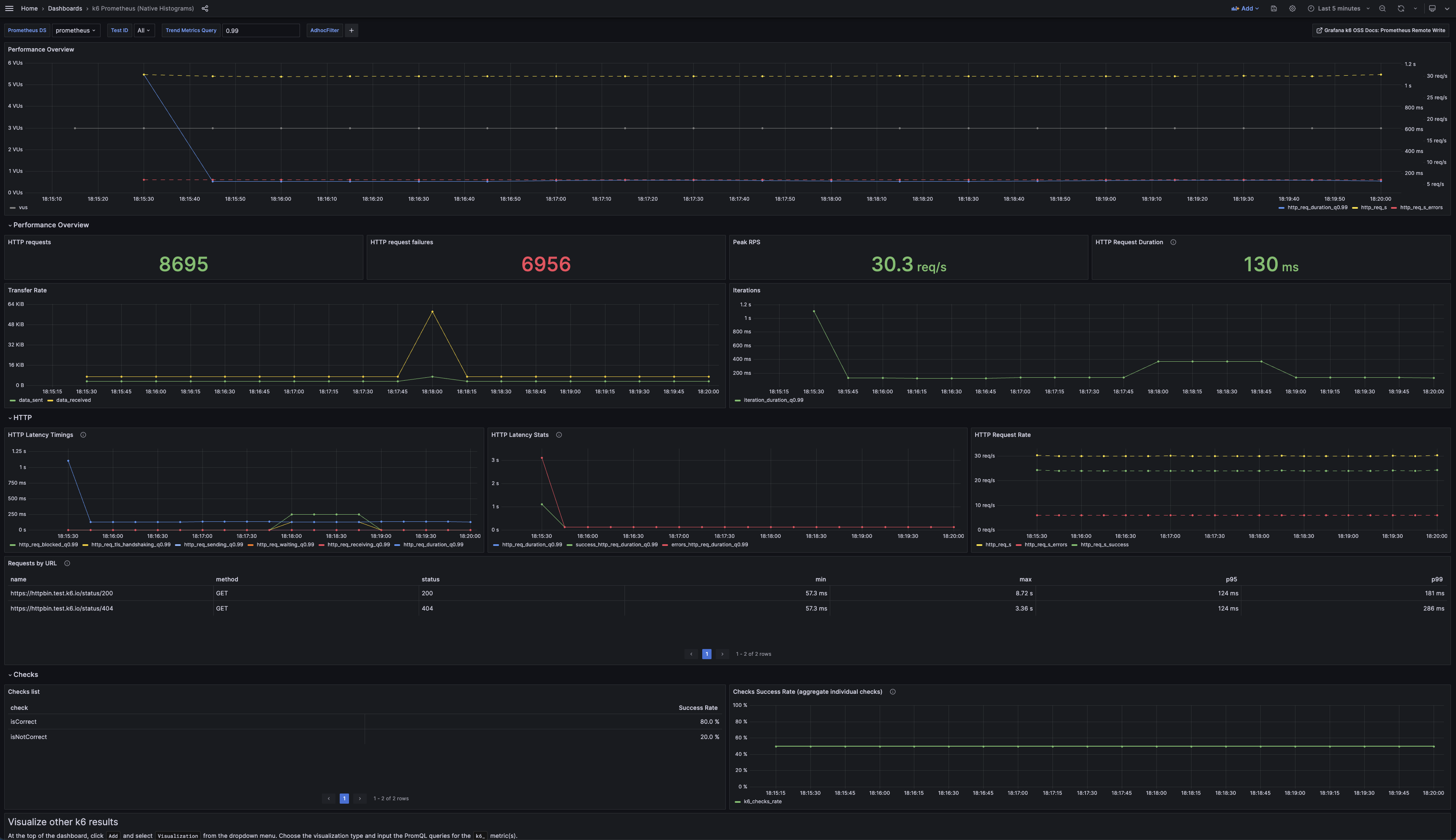 This dashboard queries k6 test result metrics stored in Prometheus with k6 trend metrics converting to native histogram metrics. Check out the k6 docs to enable native histogram on Prometheus and the k6 output option.