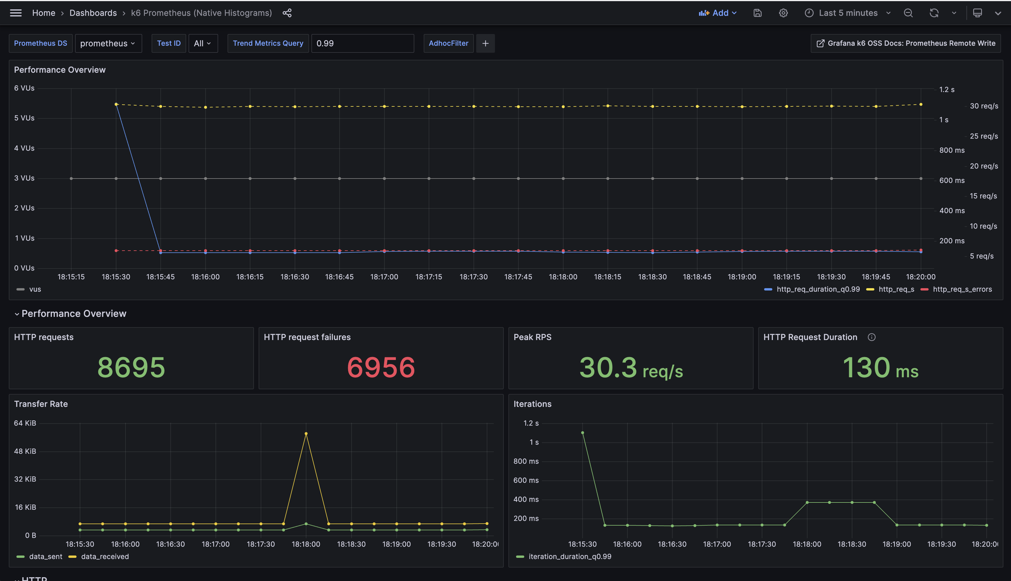 If you have not exported k6 metrics as native histograms, use the k6 Prometheus Dashboard.