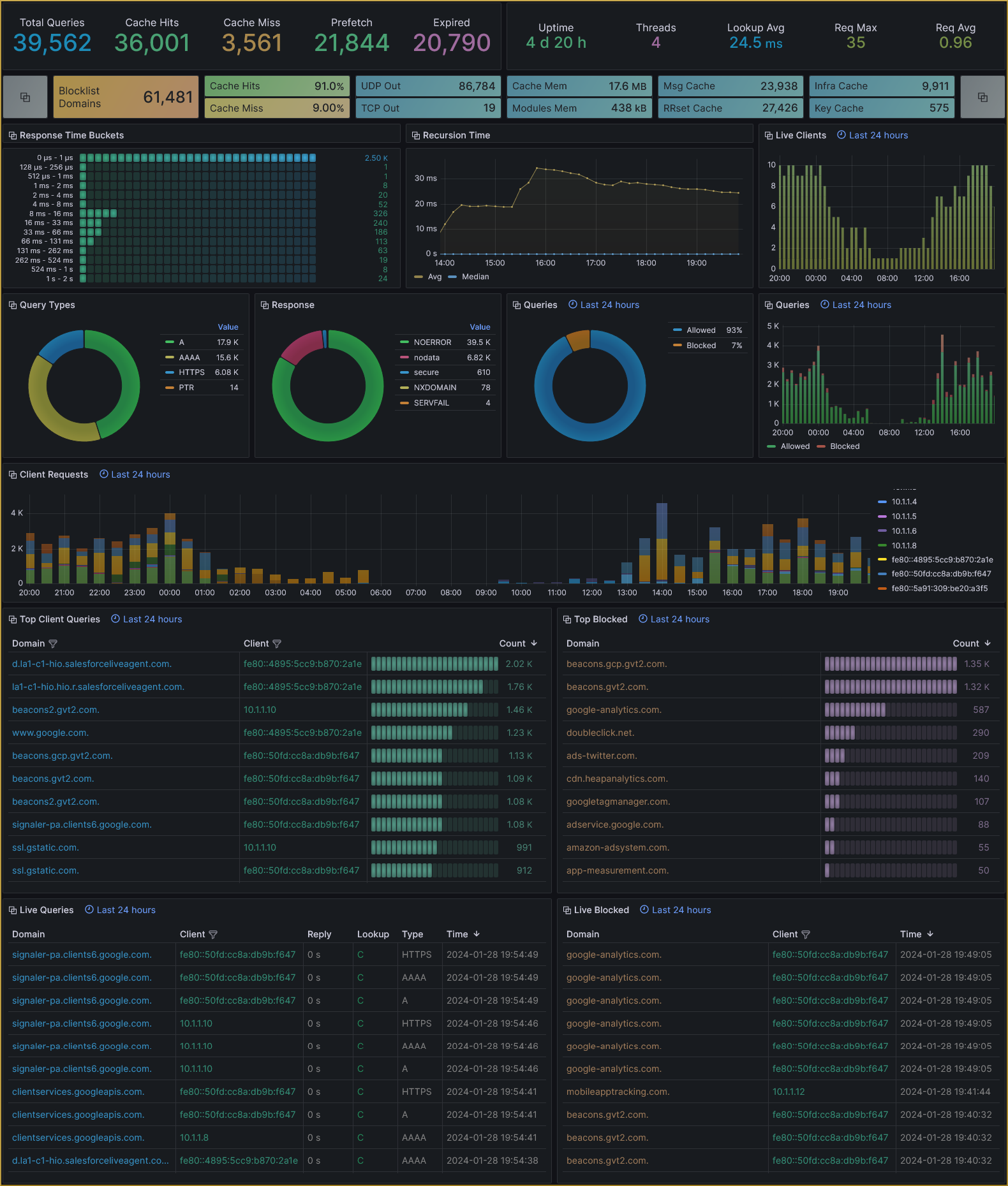 Unbound metrics & logs dashboard using Prometheus and Loki