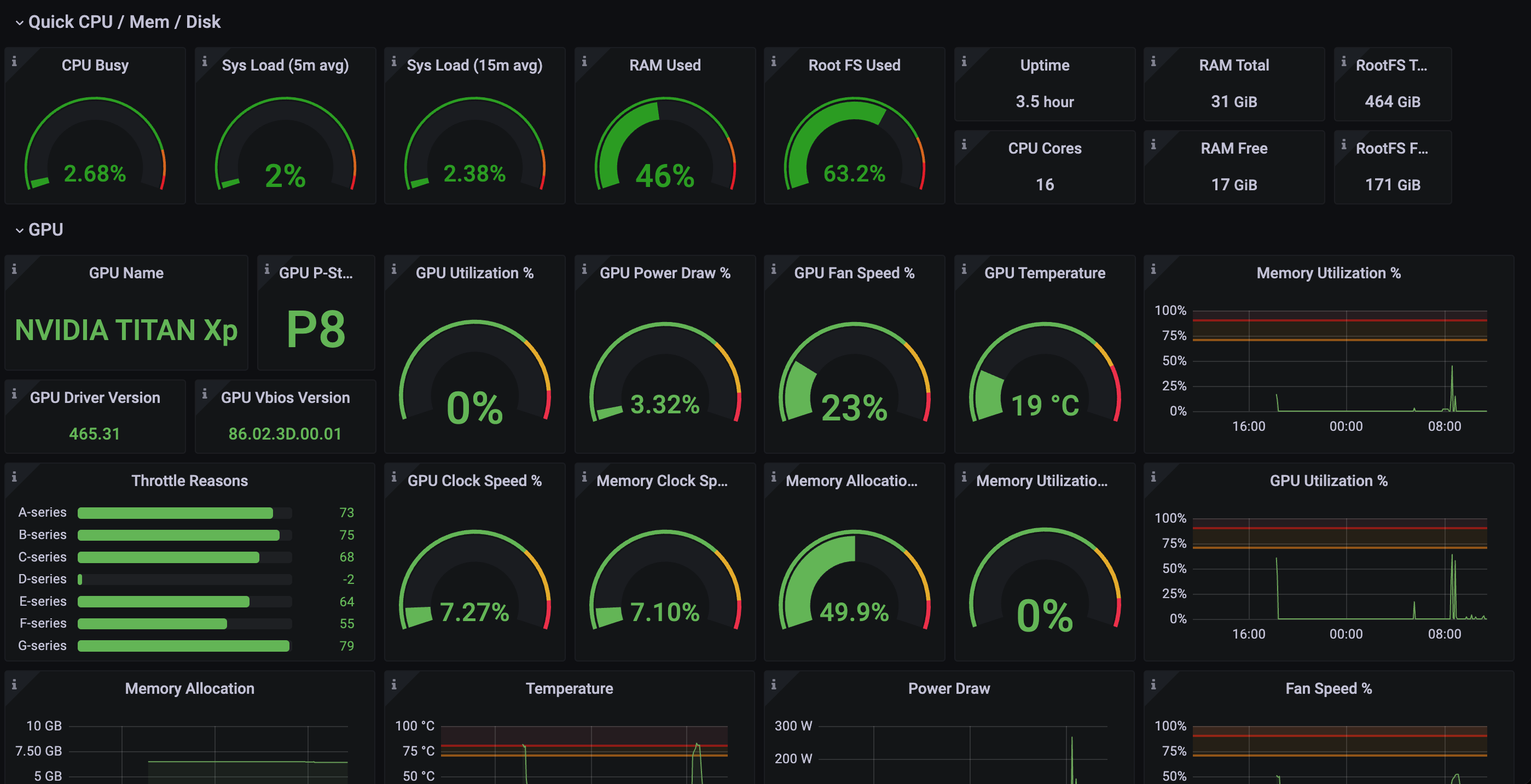The Node Expoter and Nivdia Expoter dashboard uses the prometheus data source to create a Grafana dashboard with the bargauge, gauge, graph, stat and timeseries panels.