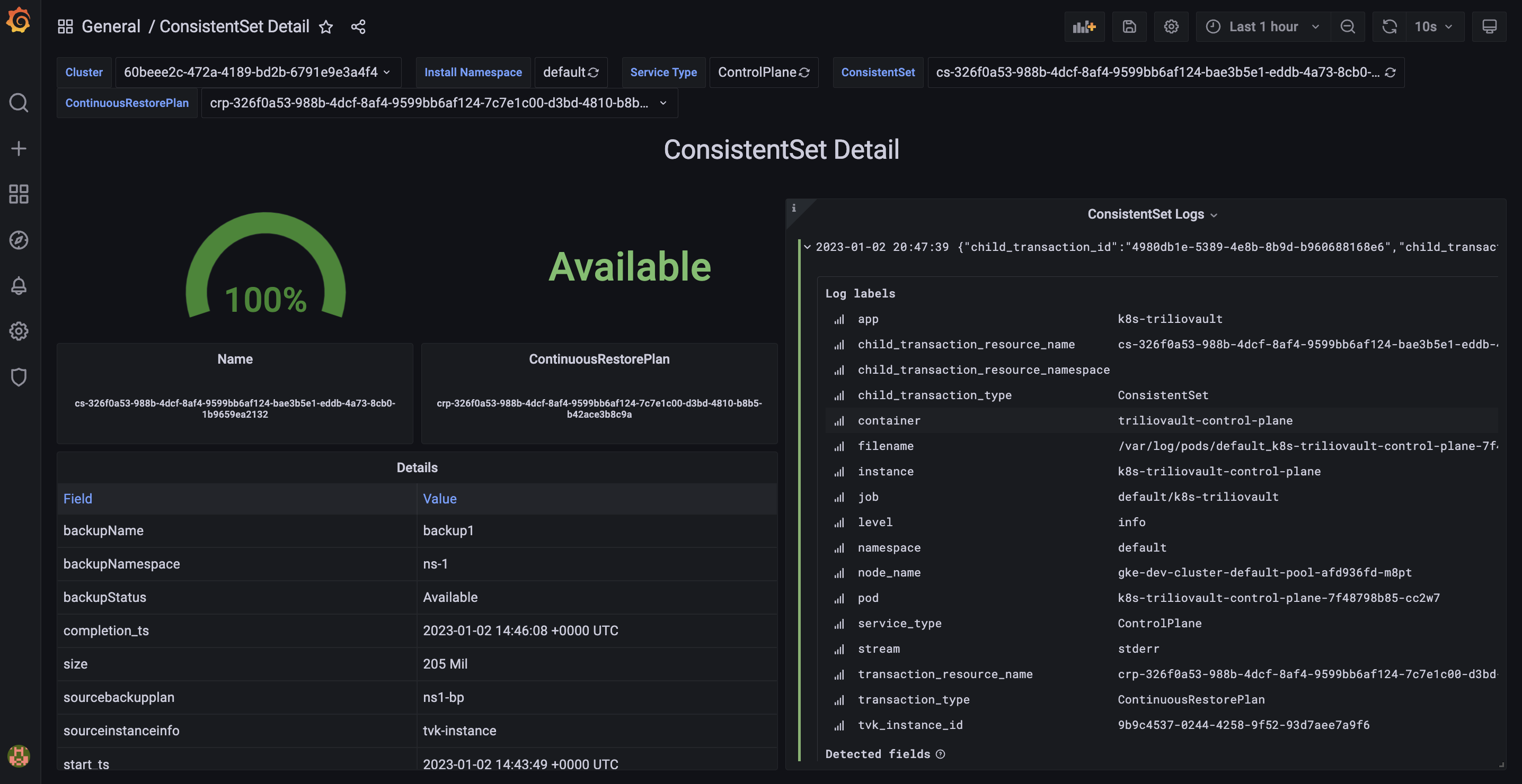The ConsistentSet Detail dashboard uses the loki and prometheus data sources to create a Grafana dashboard with the gauge, logs, stat, table and text panels.