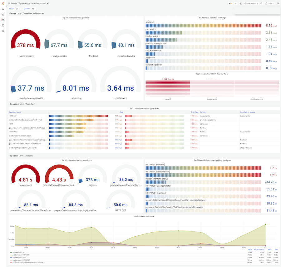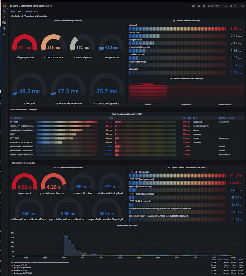 Spanmetrics sample dashboard from Openetelemetry Demo App 1.4 release.For any application deriving spanmetrics.
