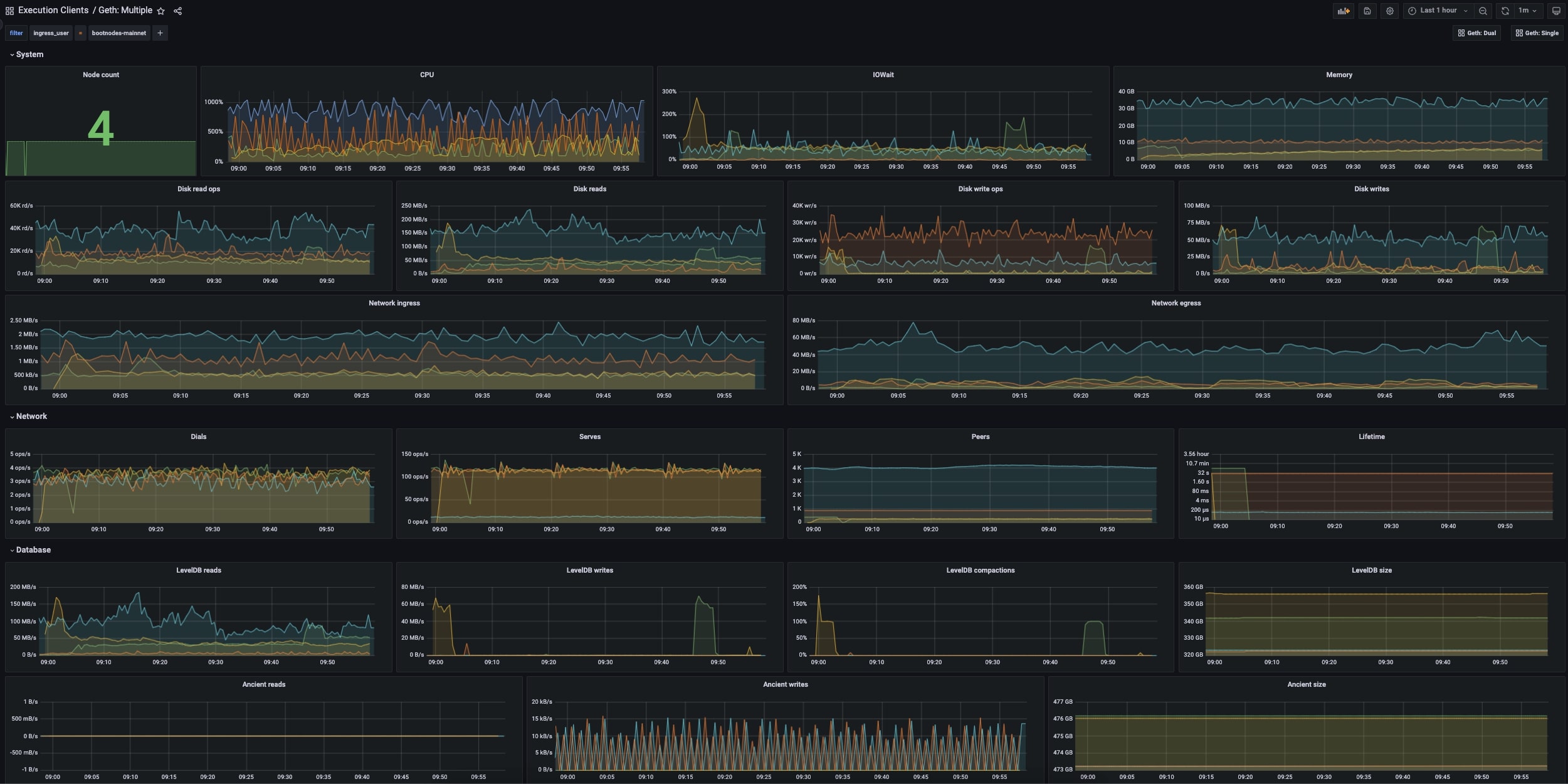 This dashboard shows metrics for multiple geth instances. Read the metrics documentation for further information on how to setup metrics.