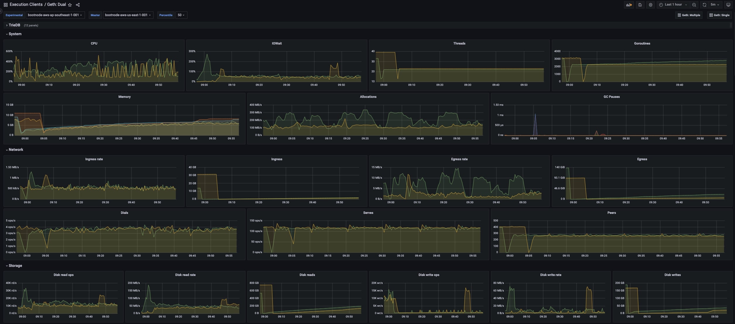 Various metrics for two geth instances. Useful for benchmark comparisons.