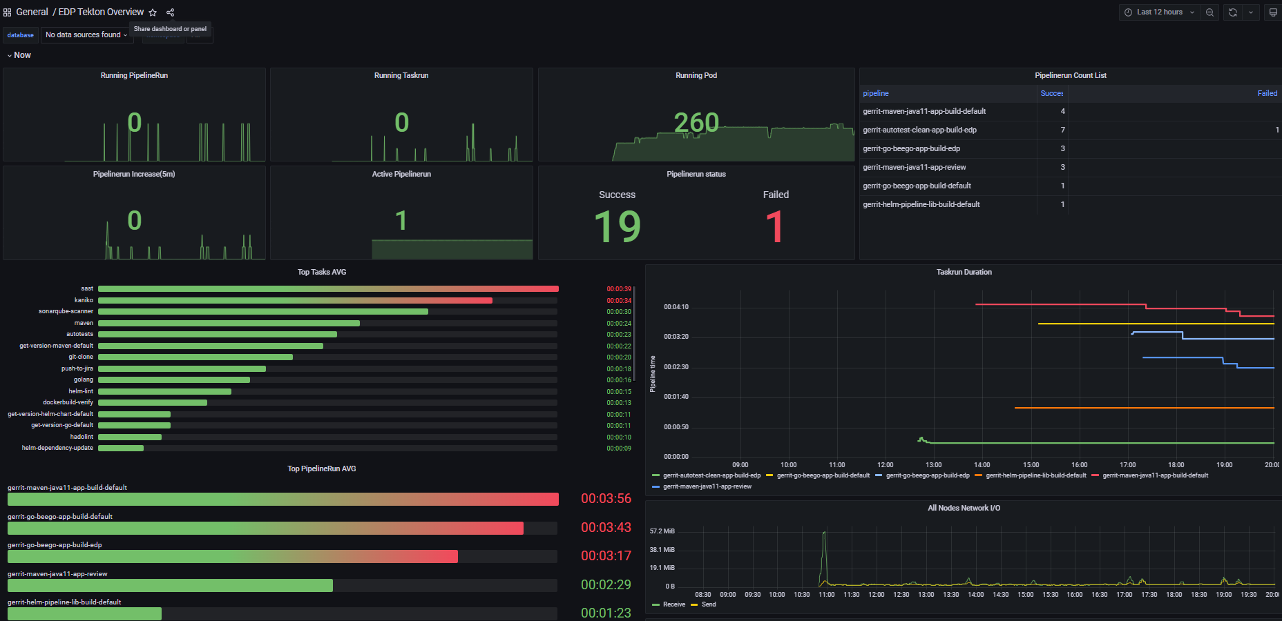 The KRCI Tekton overview dashboard uses the prometheus data source to create a Grafana dashboard with the bargauge, stat, table and timeseries panels.
