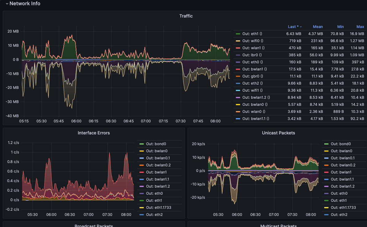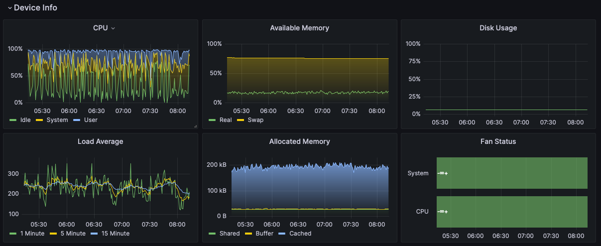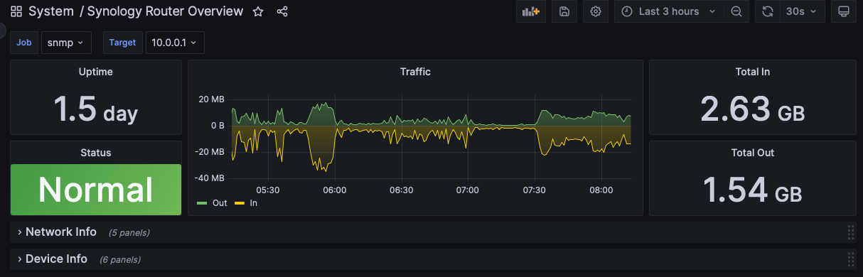 This dashboard provides metrics from the synology module of snmp_exporter, specifically for Synology SRM routers.