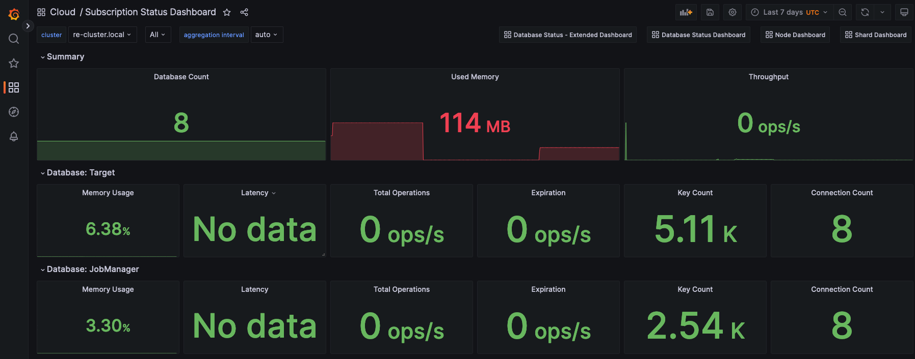 All Redis Cloud databases are scoped within a subscription. To effectively monitor your Redis Cloud deployment, we recommend two Grafana dashboards: