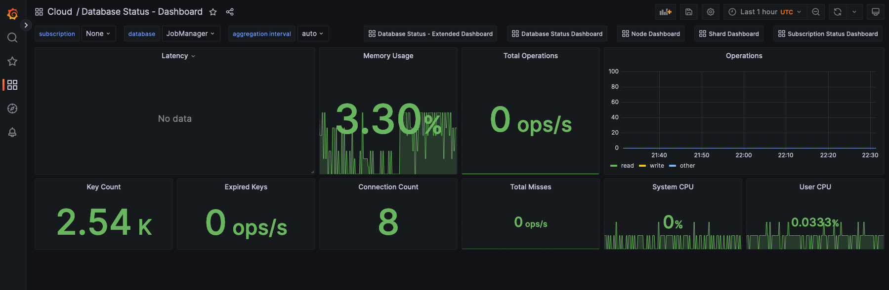 All Redis Cloud databases are scoped within a subscription. To effectively monitor your Redis Cloud deployment, we recommend two Grafana dashboards:
