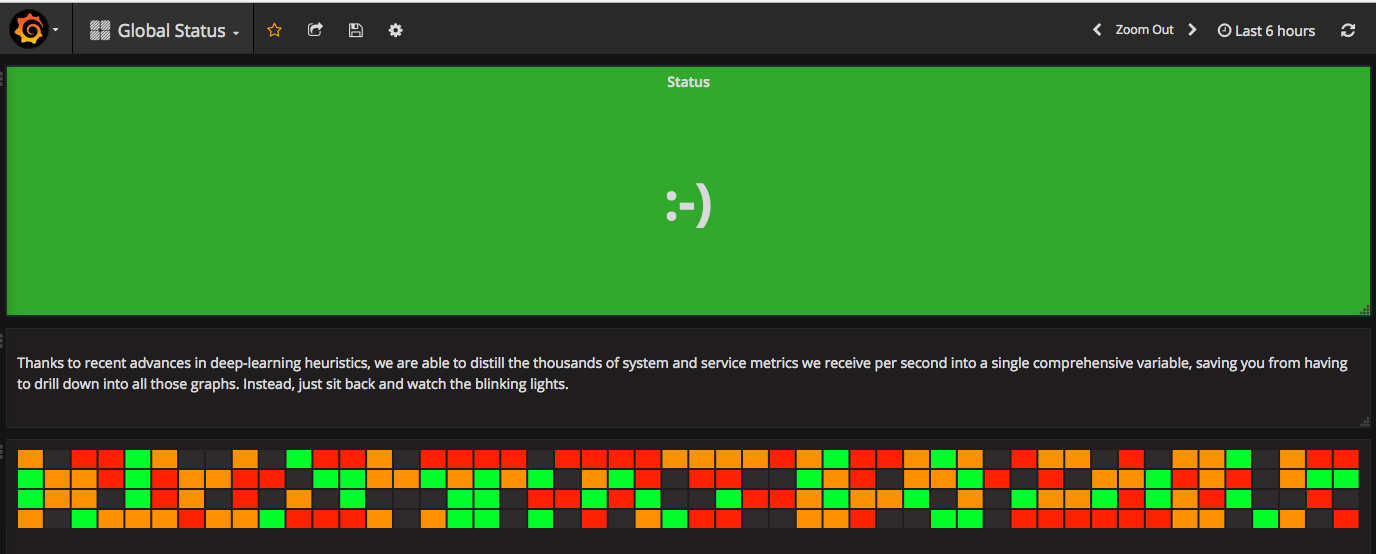 So I was sitting there, looking at my dozen Grafana deployments, with over a hundred dashboards, and said to myself "self, this is getting ridiculous. The users and management don't even really want all these graphs anyways, they just want to know if their systems and services are ok." With that realization, I threw all those dashboards away and created a single, very simple dashboard, that utilizes the latest in deep learning heuristics to distill the thousands of monitoring streams, user browsing history, and the coffee pot status into a single comprehensive status.