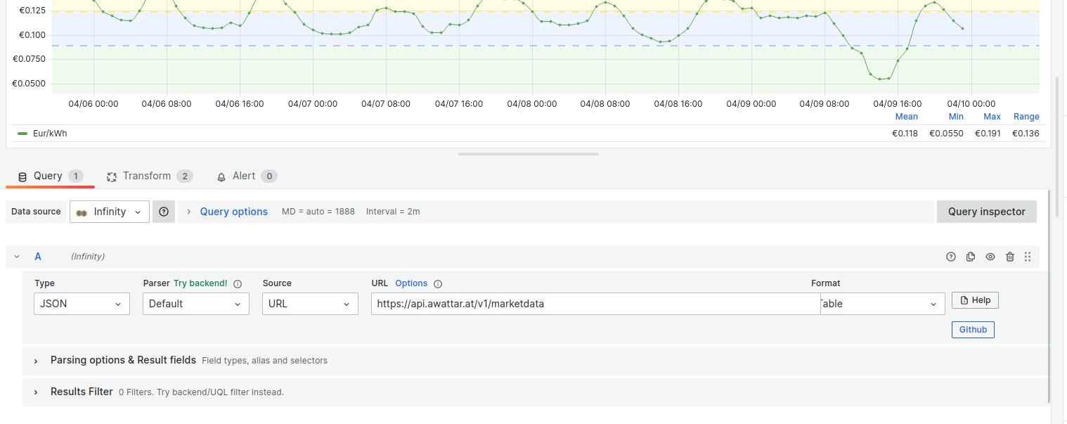 Awattar is an austrian electricity supplier which offers an hourly electricity price and the corresponding api (https://www.awattar.at/services/api/). This dashboard queries the rest api with the infinity plugin & displays the price on an clearly dashboard.