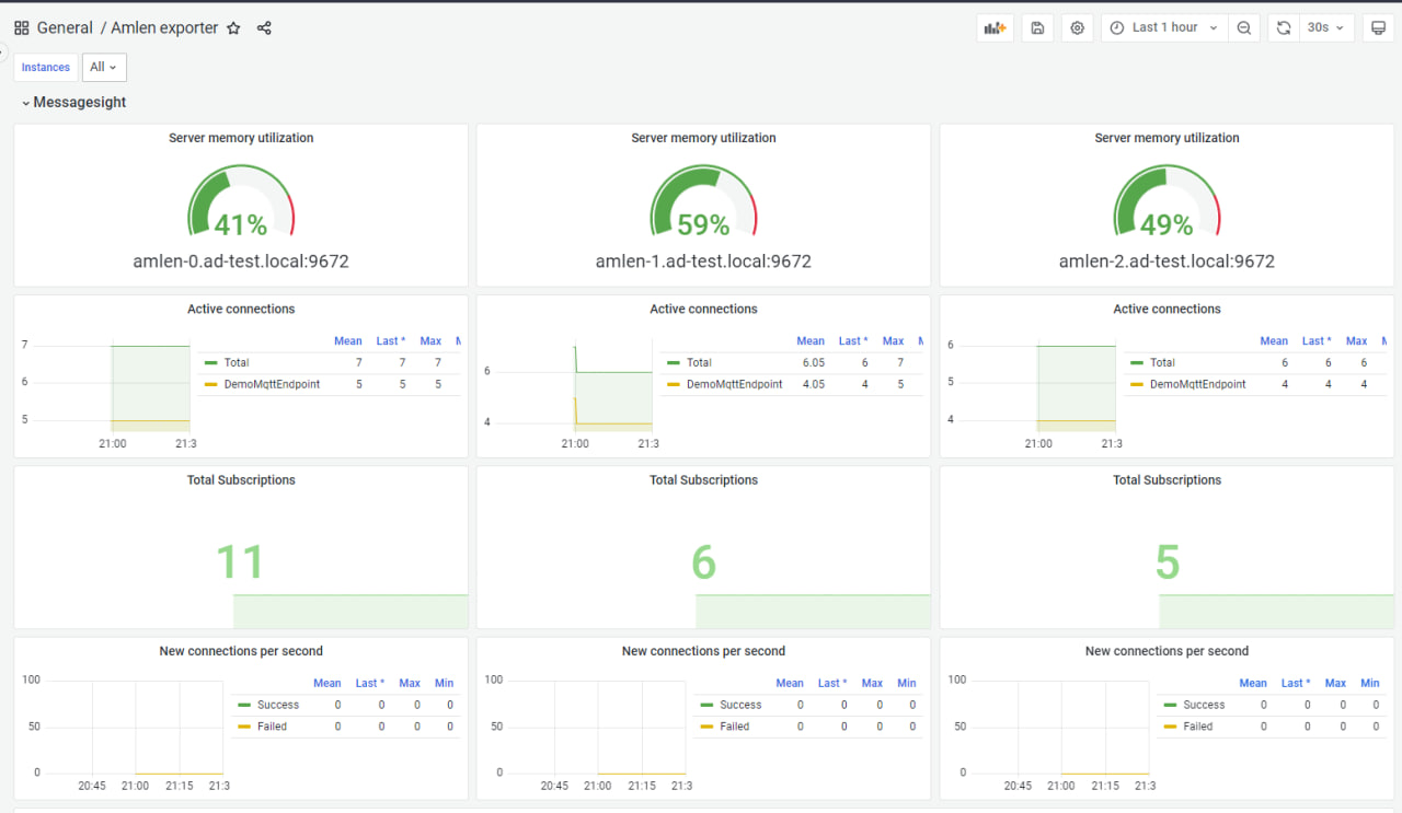 The Amlen exporter dashboard uses the data source to create a Grafana dashboard with the panel.