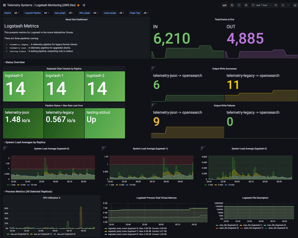 Logstash Health Monitoring: System, JVM, Pipeline and individual plugin stats for Logstash replicas running on Kubernetes.