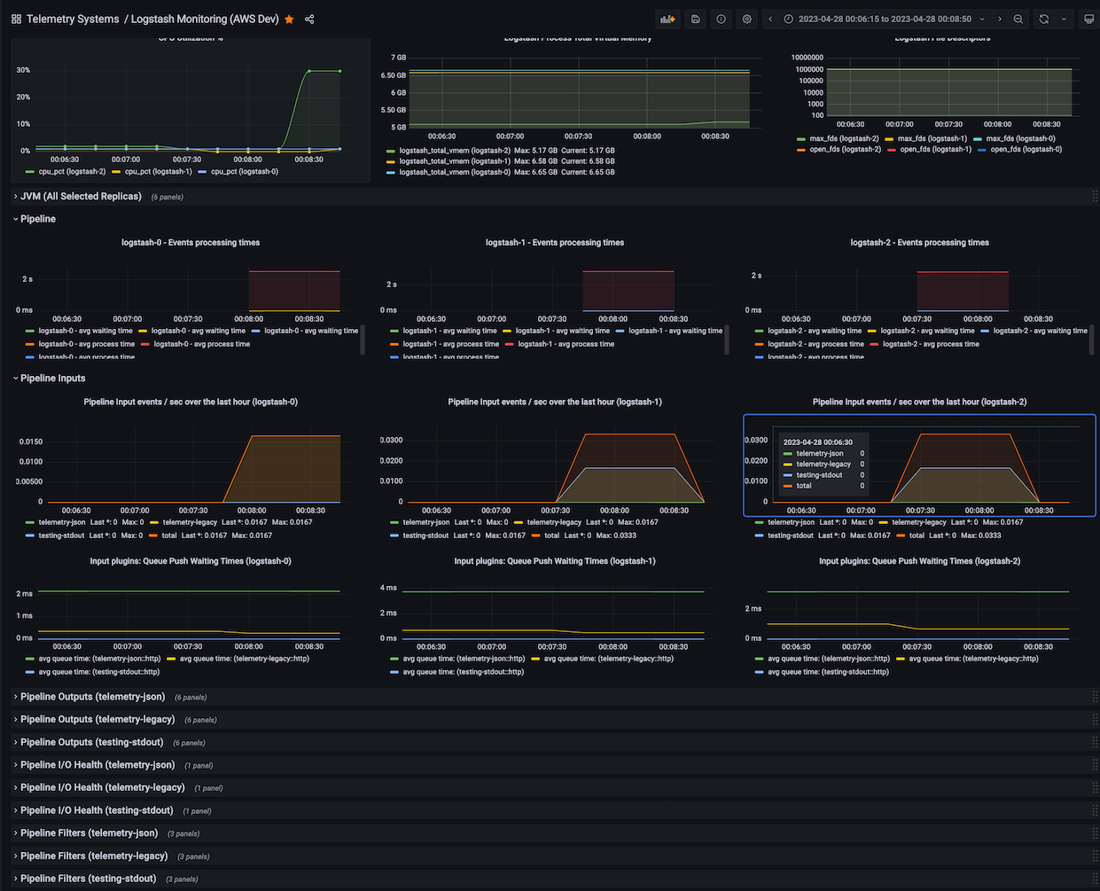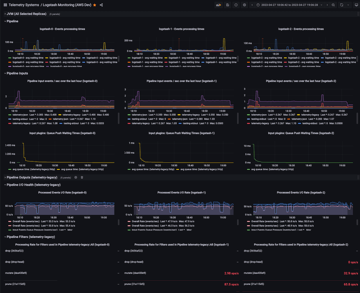 Monitoring for all Logststash replicas running in Kubernetes, Filterable by pod, pipeline, and plugin types and names. Rich metrics for High-Levels, Inputs, Filters, and Outputs.