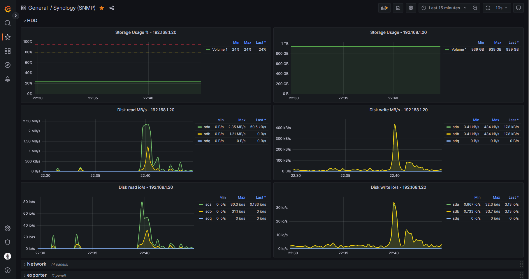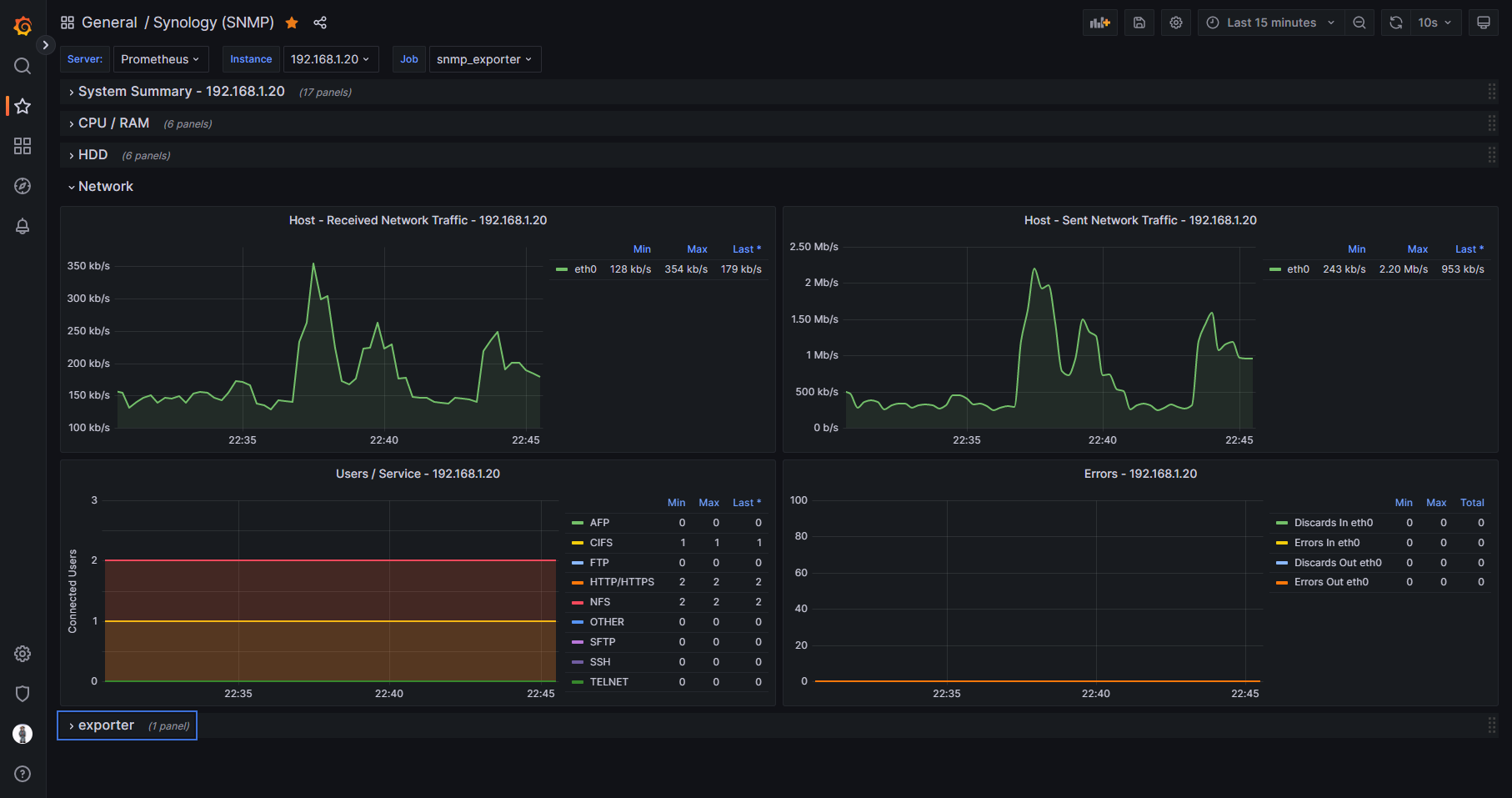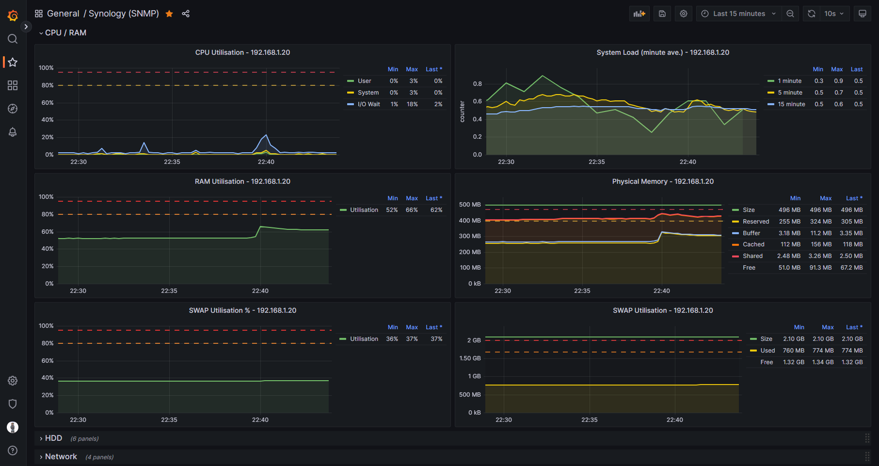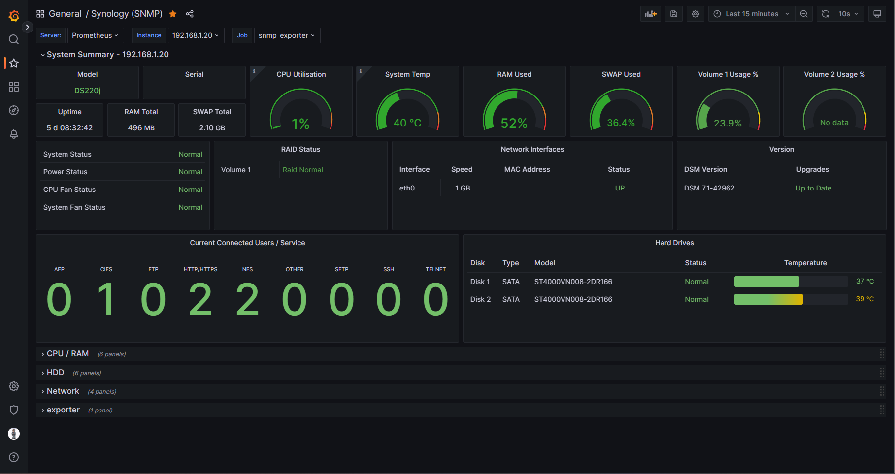 Without the need for using containers such as Cadvisor or Node_Exporter, this dashboard is able to run on J series Synology NAS devices that cannot run Docker. The example screenshots are of this dashboard viewing statistics on a Synology 220j.