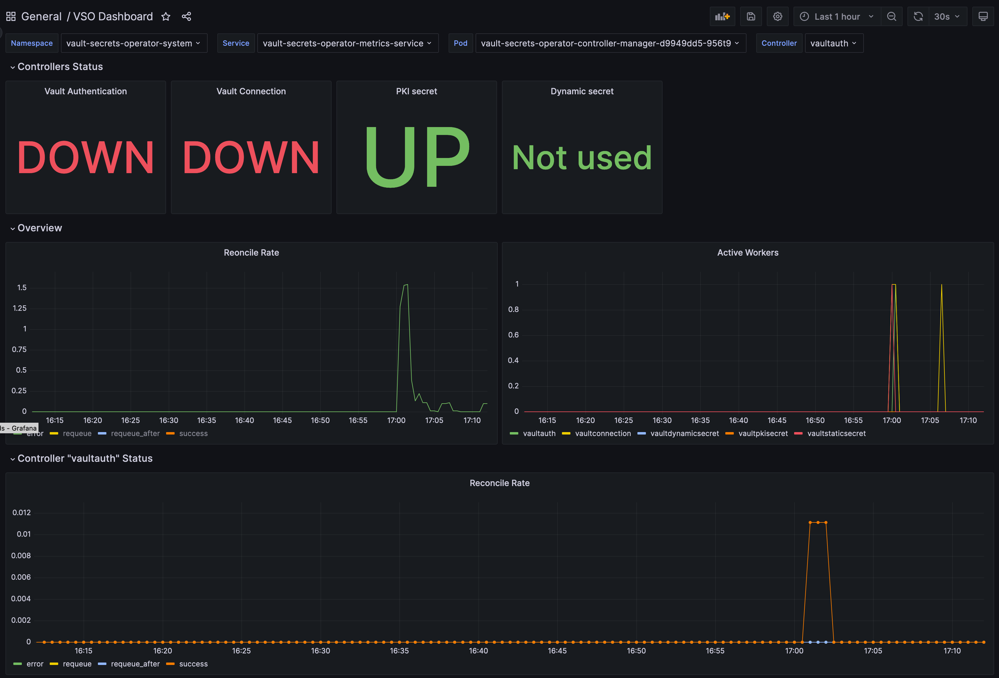The Vault Sync Operator Dashboard dashboard uses the prometheus data source to create a Grafana dashboard with the heatmap, stat and timeseries panels.