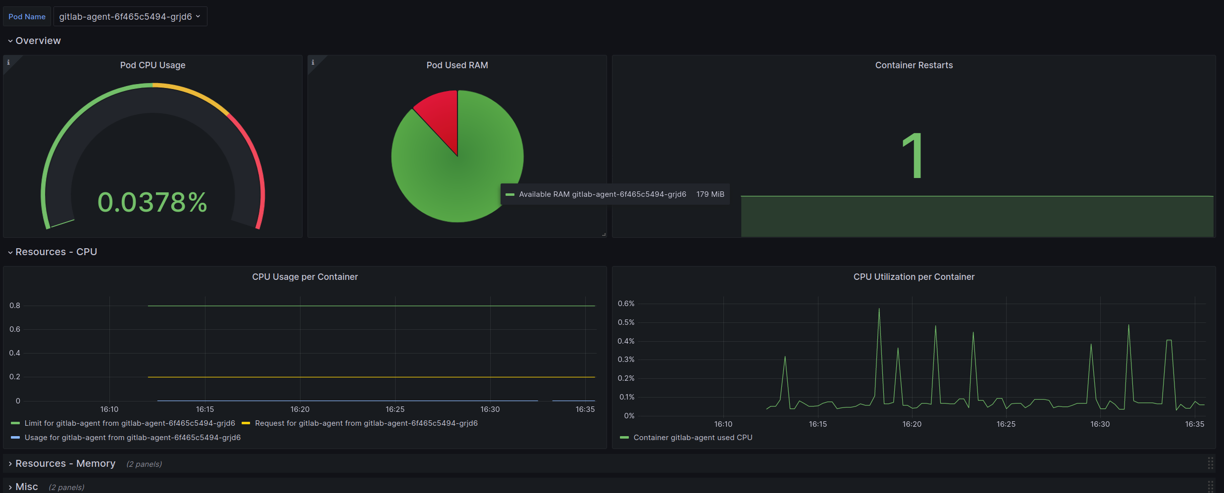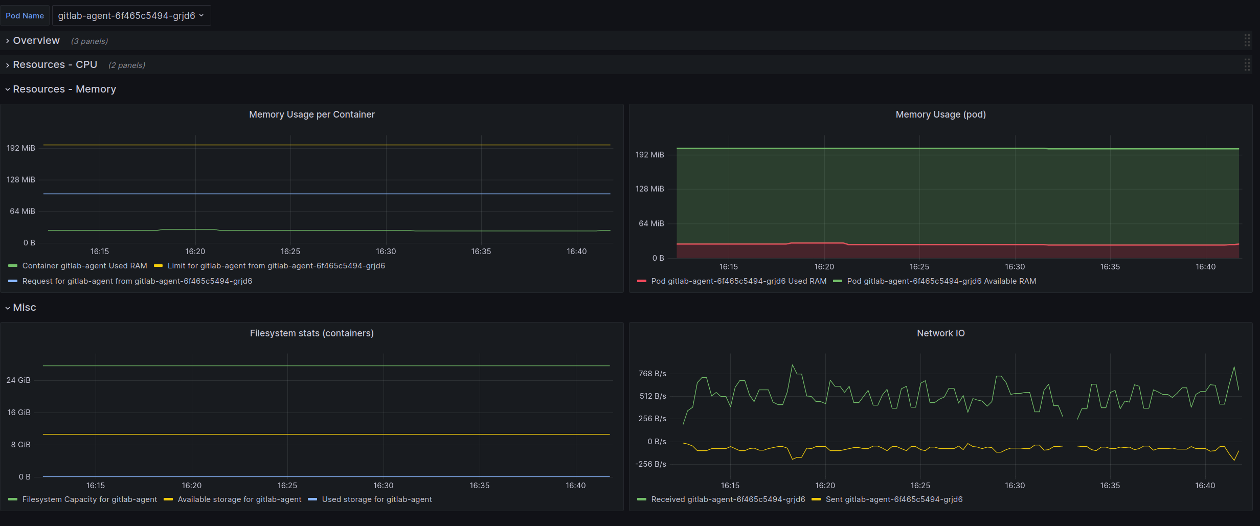 This dashboard shows important information from pods running in a kubernetes cluster. It relies on metrics collected using Otel's Kubelet Stats receiver and Otel's Kubernetes cluster receiver. The following snippet shows an OpenTelemetry collector's configuration that should scrape the metrics required by this dashboard: