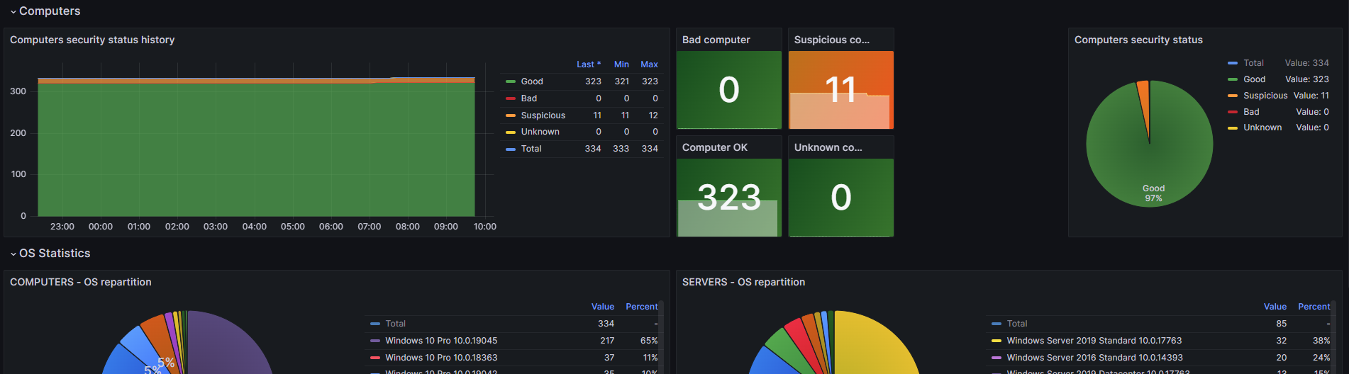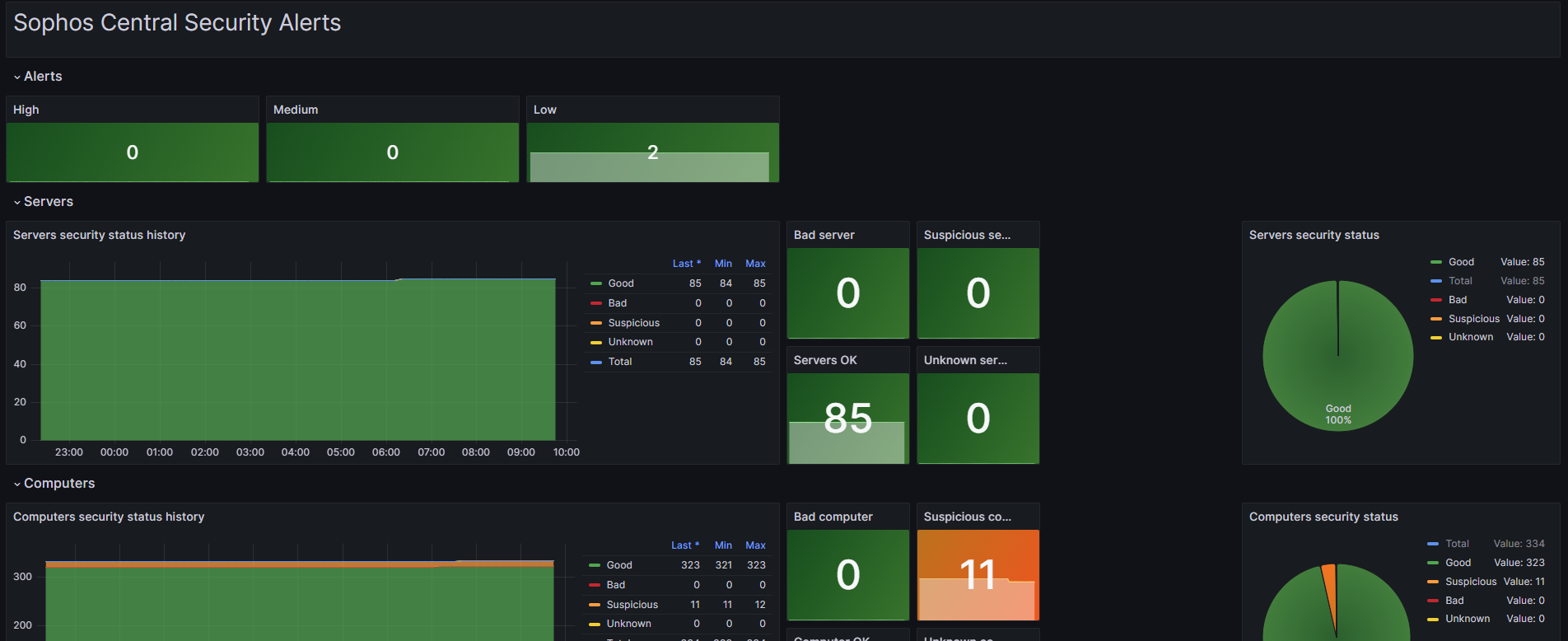 This helps you monitor and share the security status of your Sophos security solution. To setup this dashboard, please check the dedicated github to get the Telegraf configuration and the python script to collect the data from Sophos Central.