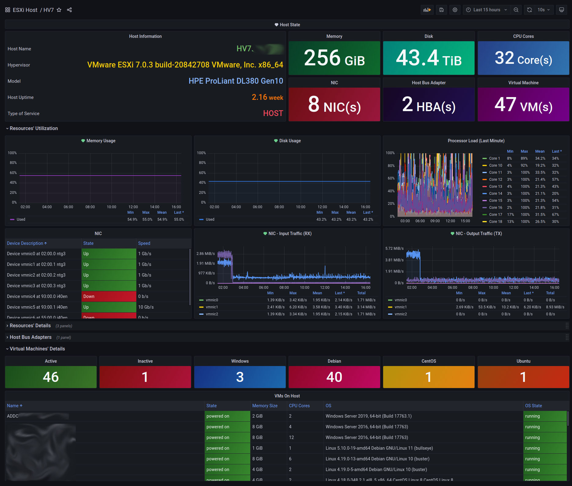 A dashboard for visualizing collected ESXi hypervisor data (including hosted VMs) from the target's SNMP port using Telegraf.