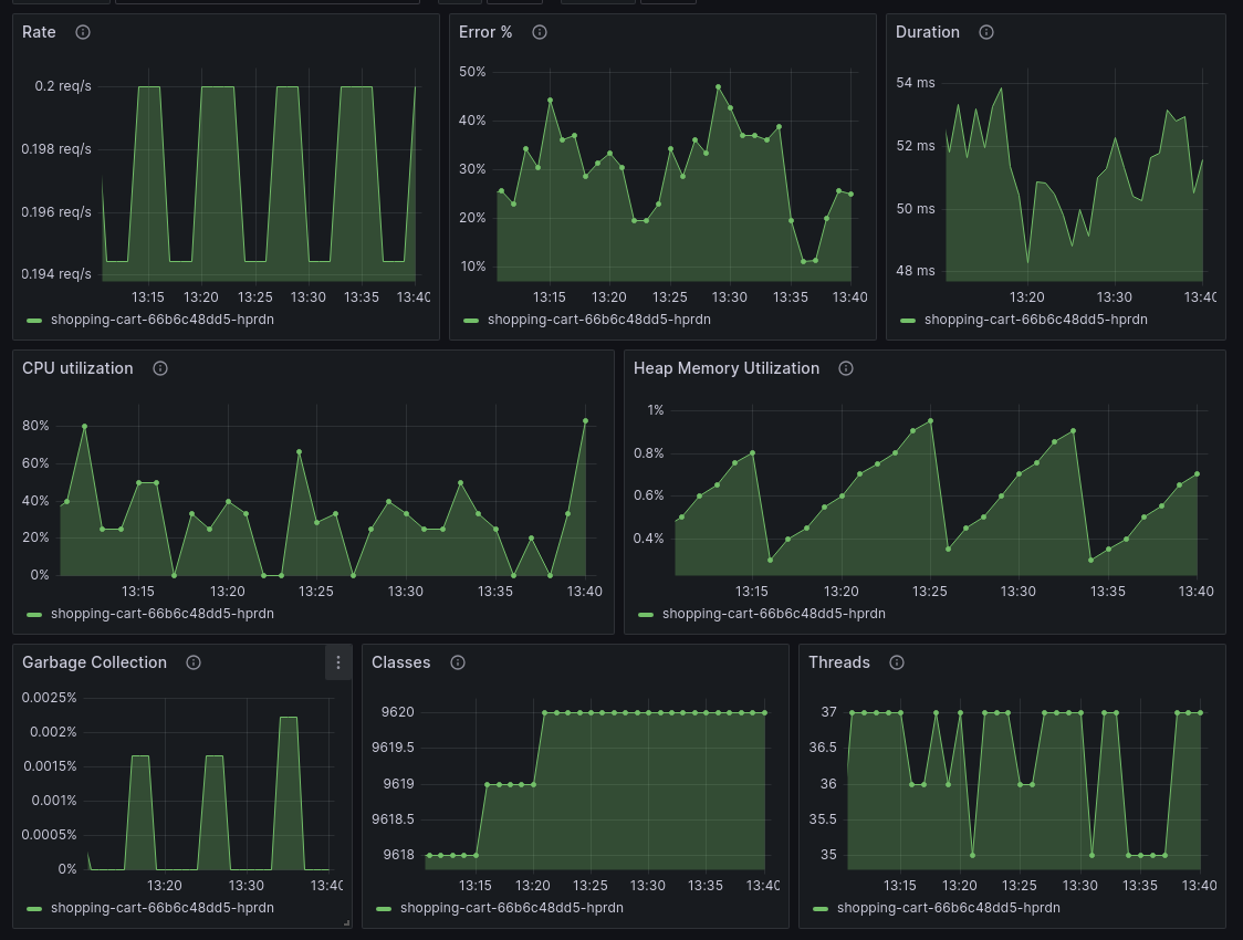 JVM metrics: CPU, memory, classes, threads, and garbage collection.