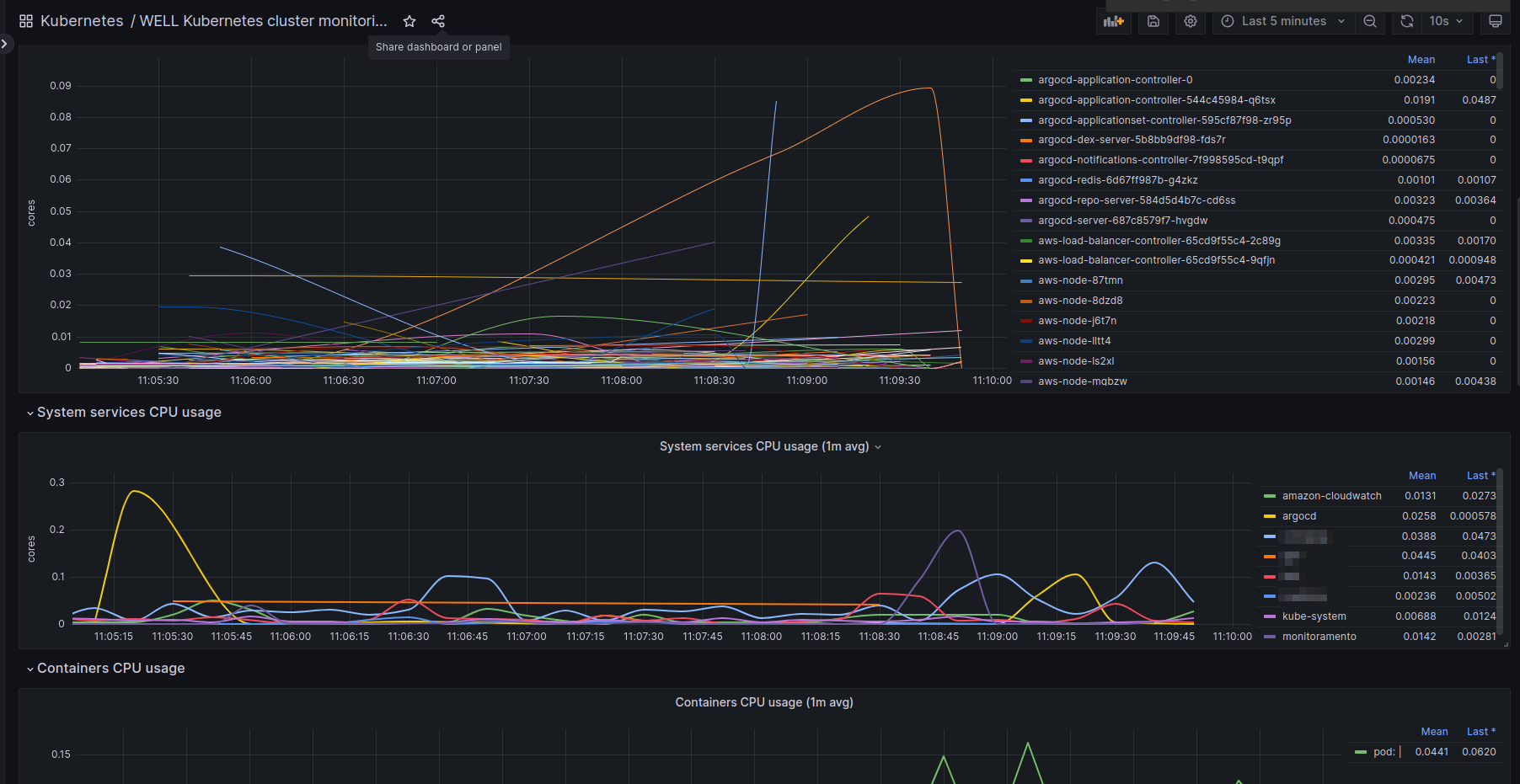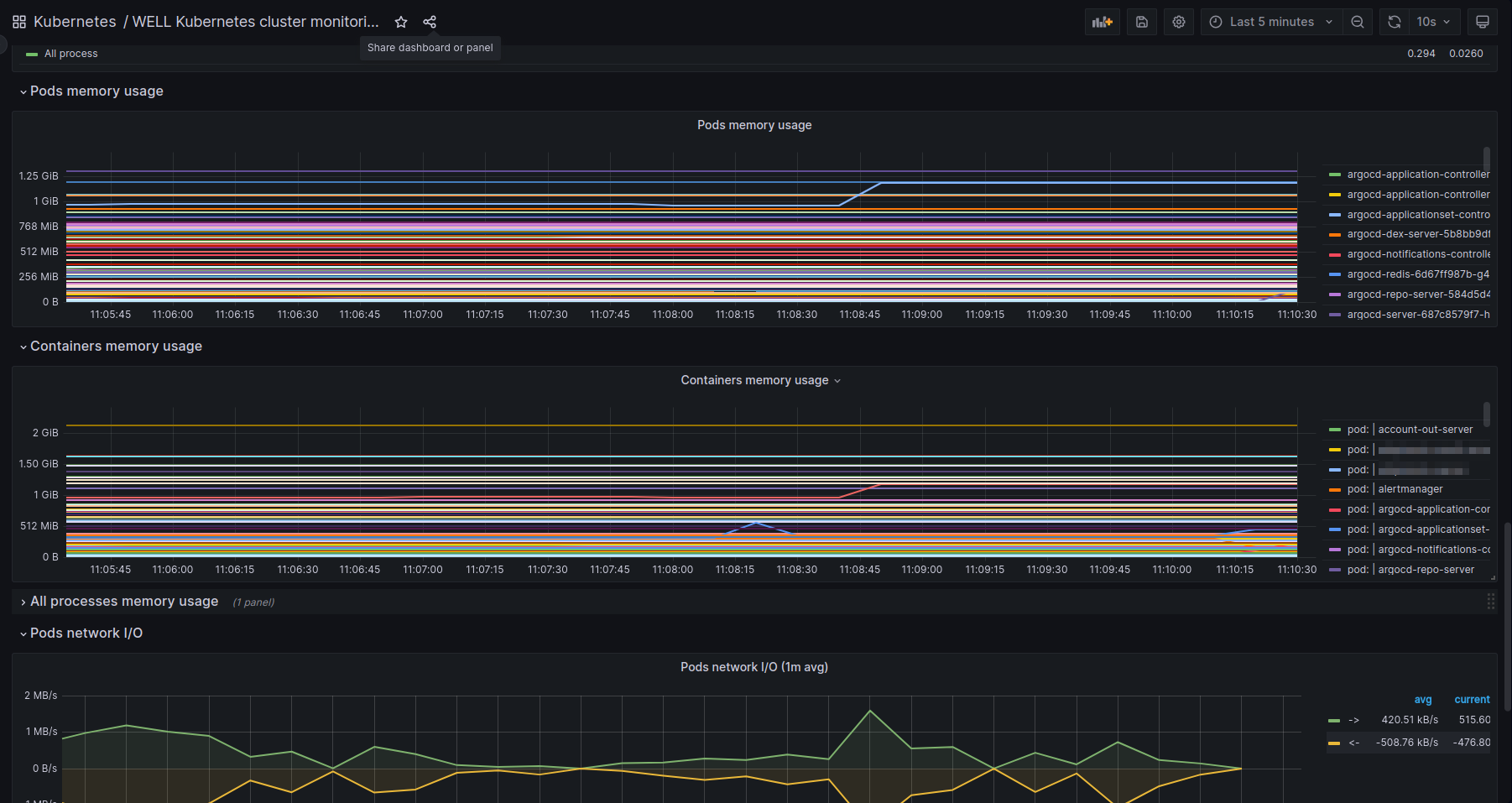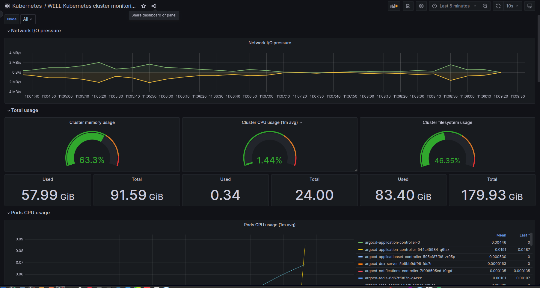 The WELL Kubernetes cluster monitoring dashboard uses the prometheus data source to create a Grafana dashboard with the gauge, graph, stat and timeseries panels.